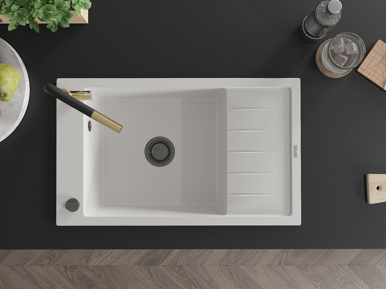 Mexen Elias zlewozmywak granitowy 1-komorowy z ociekaczem i baterią kuchenną Flora, biały - 6511-20-670401-57-B