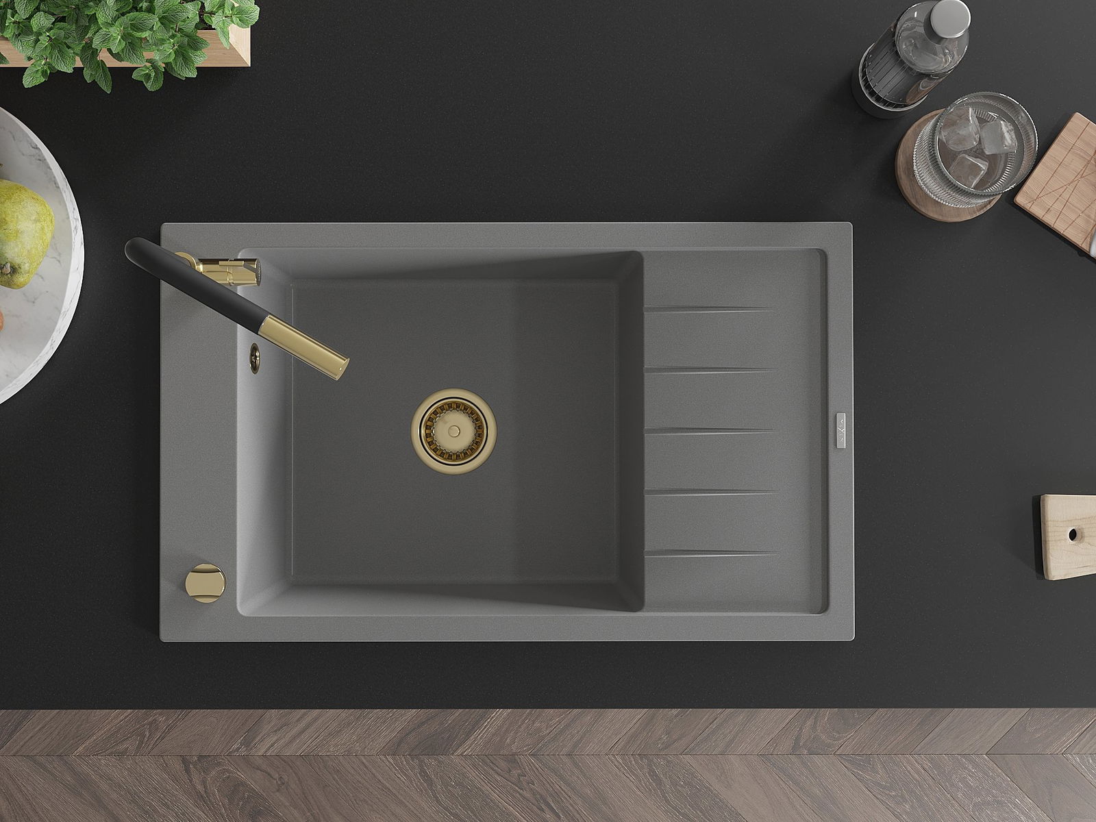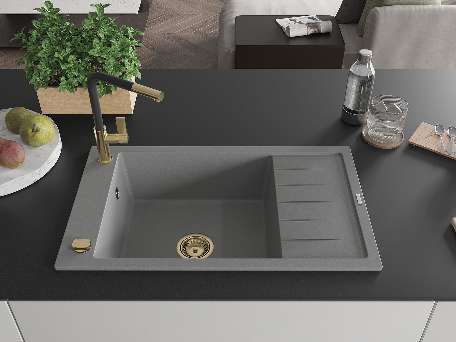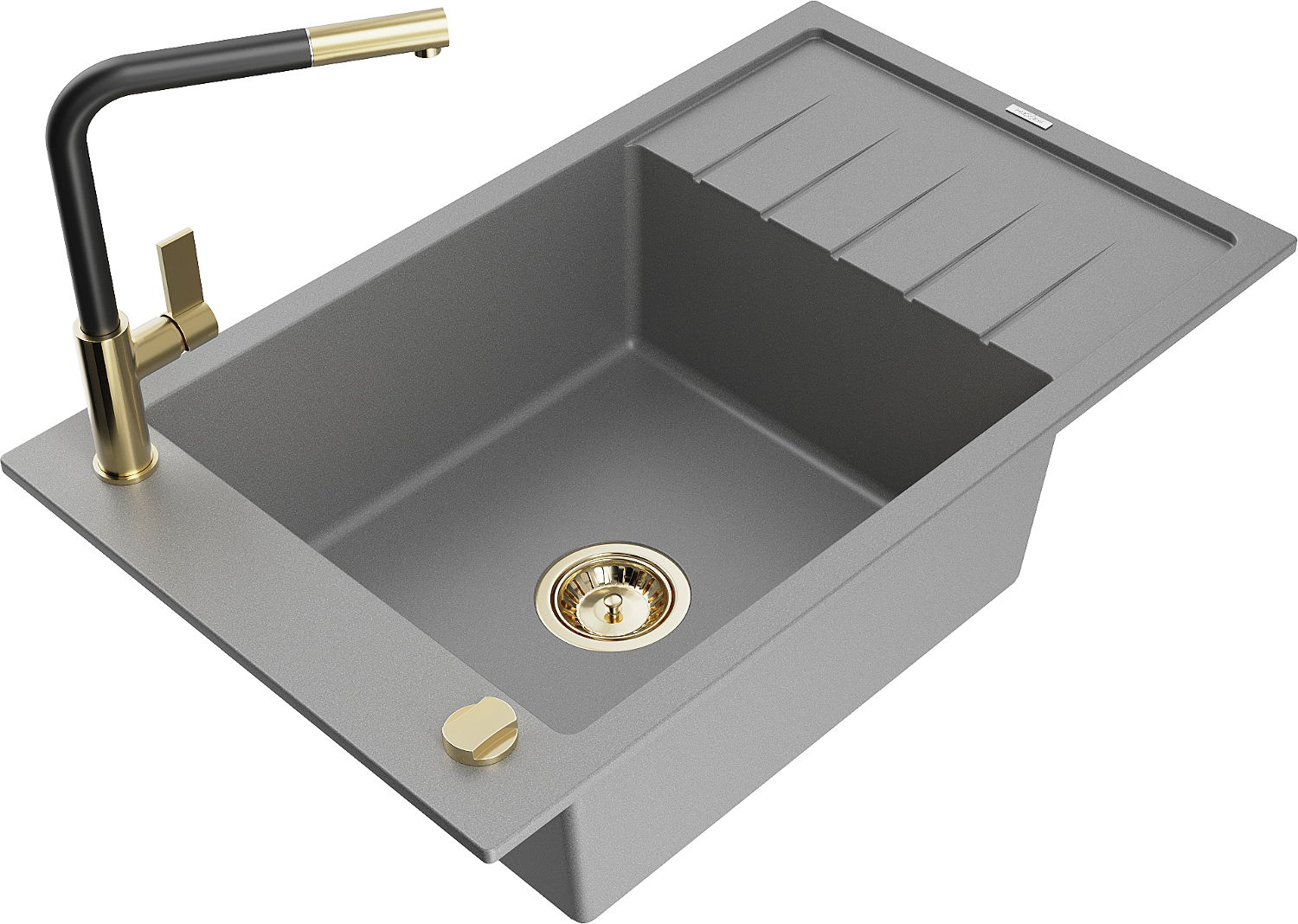 Mexen Elias zlewozmywak granitowy 1-komorowy z ociekaczem i baterią kuchenną Flora, szary - 6511-71-670401-57-G