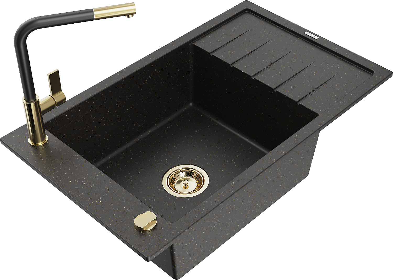 Mexen Elias zlewozmywak granitowy 1-komorowy z ociekaczem i baterią kuchenną Flora, czarny/złoty metalik - 6511-75-670401-57-G