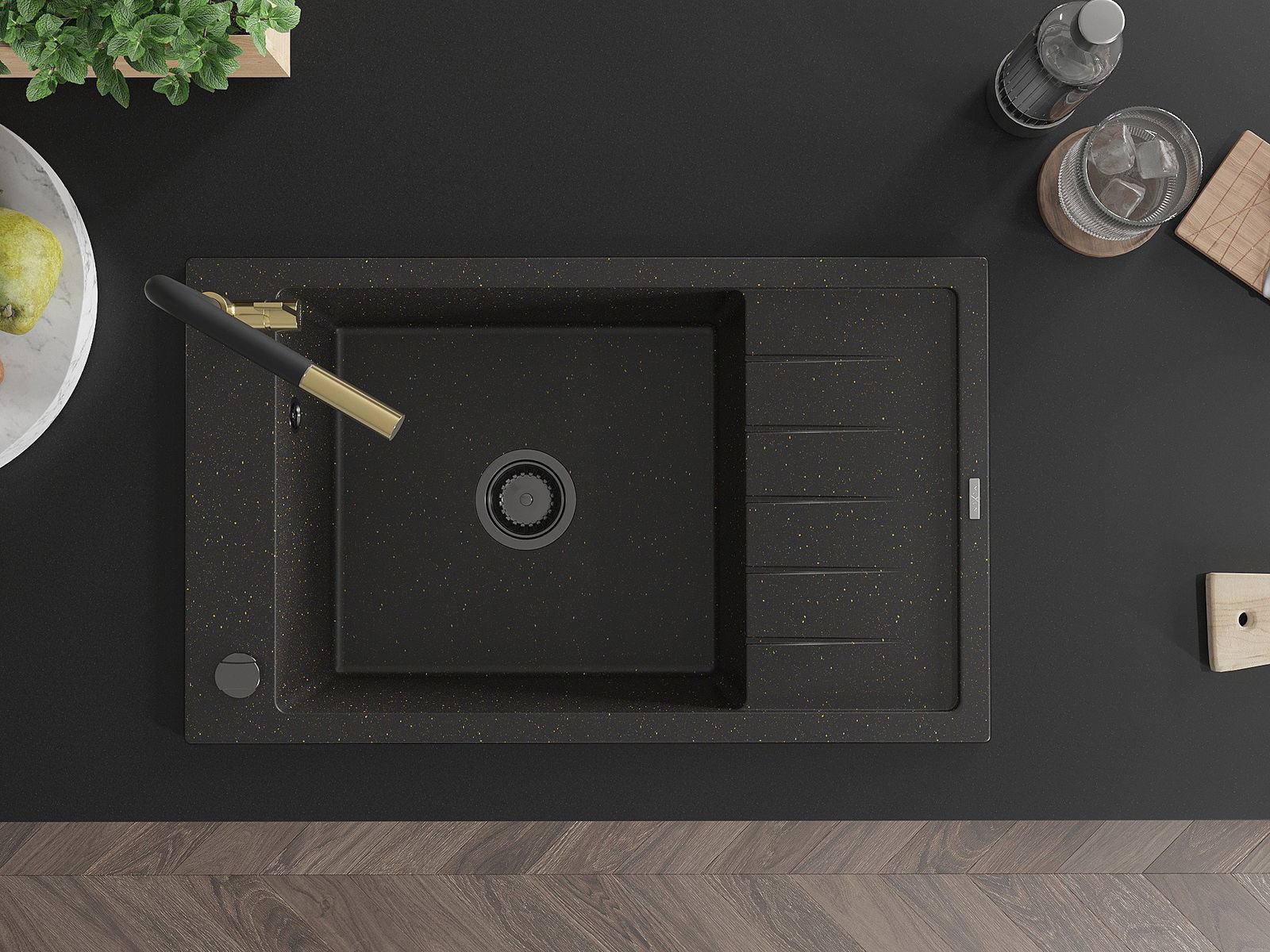 Mexen Elias zlewozmywak granitowy 1-komorowy z ociekaczem i baterią kuchenną Flora, czarny/złoty metalik - 6511-75-670401-57-B