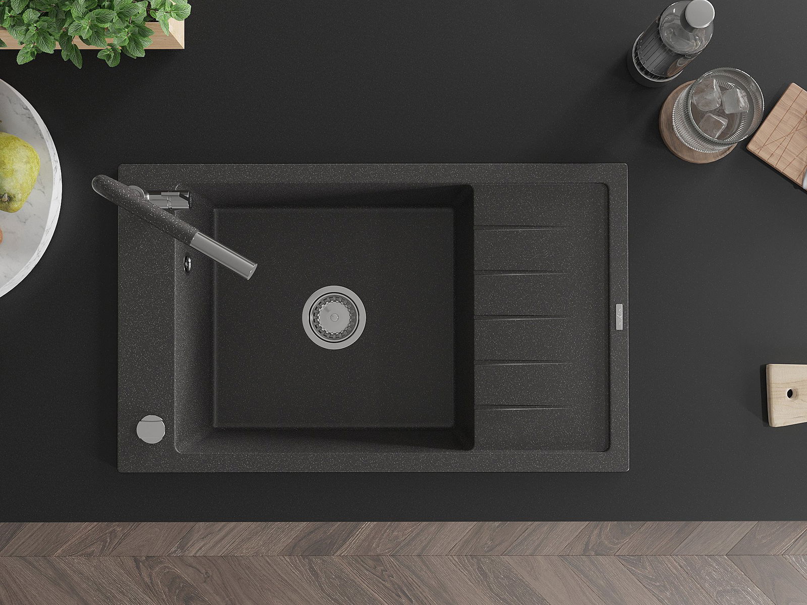 Mexen Elias zlewozmywak granitowy 1-komorowy z ociekaczem i baterią kuchenną Flora, czarny nakrapiany - 6511-76-670401-08