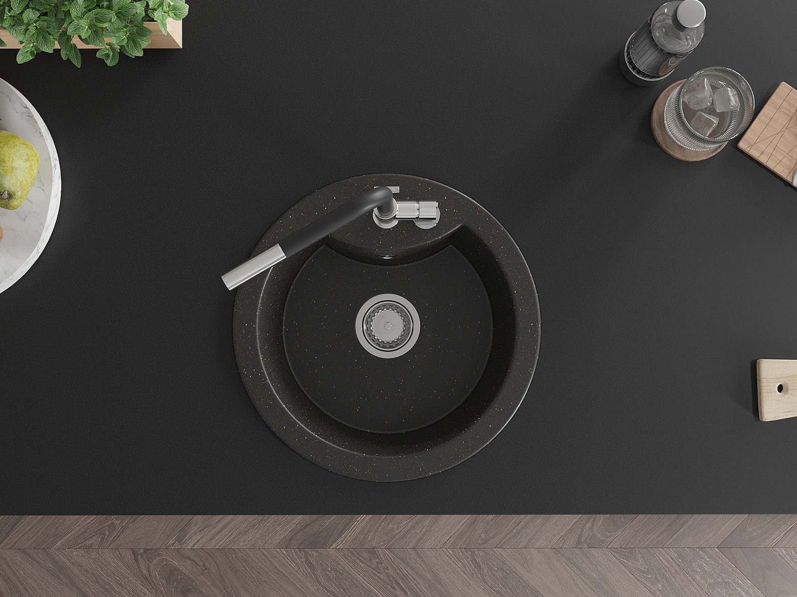 Zlew posiada podfrezowany otwór o średnicy 35 mm do samodzielnego wybicia. Można go wykorzystać m.in. do montażu dozownika na płyn, który wyeliminuje obecność plastikowych butelek w kuchni i nada jej eleganckiego wykończenia.