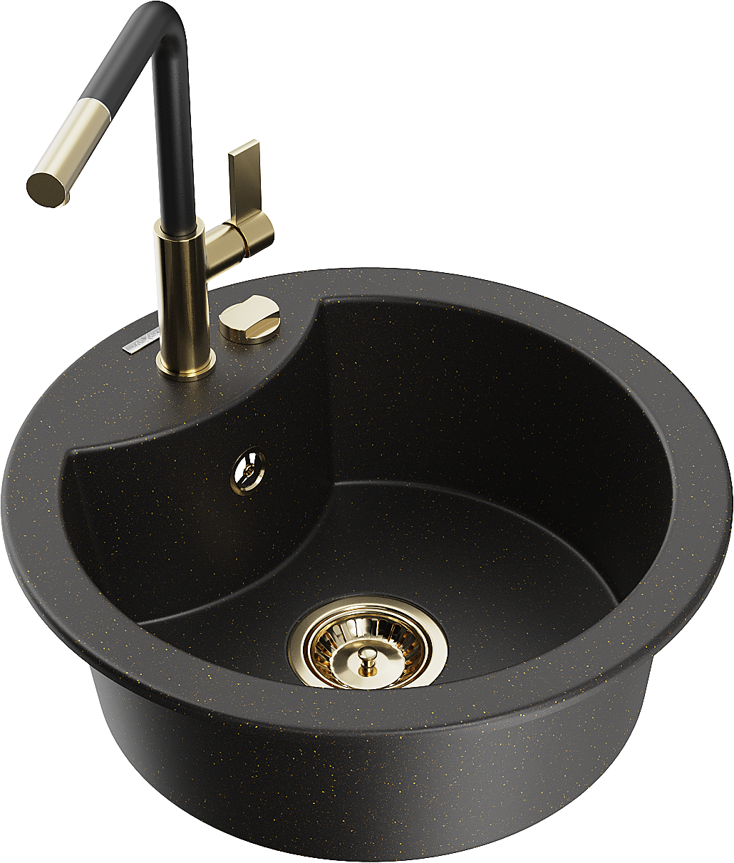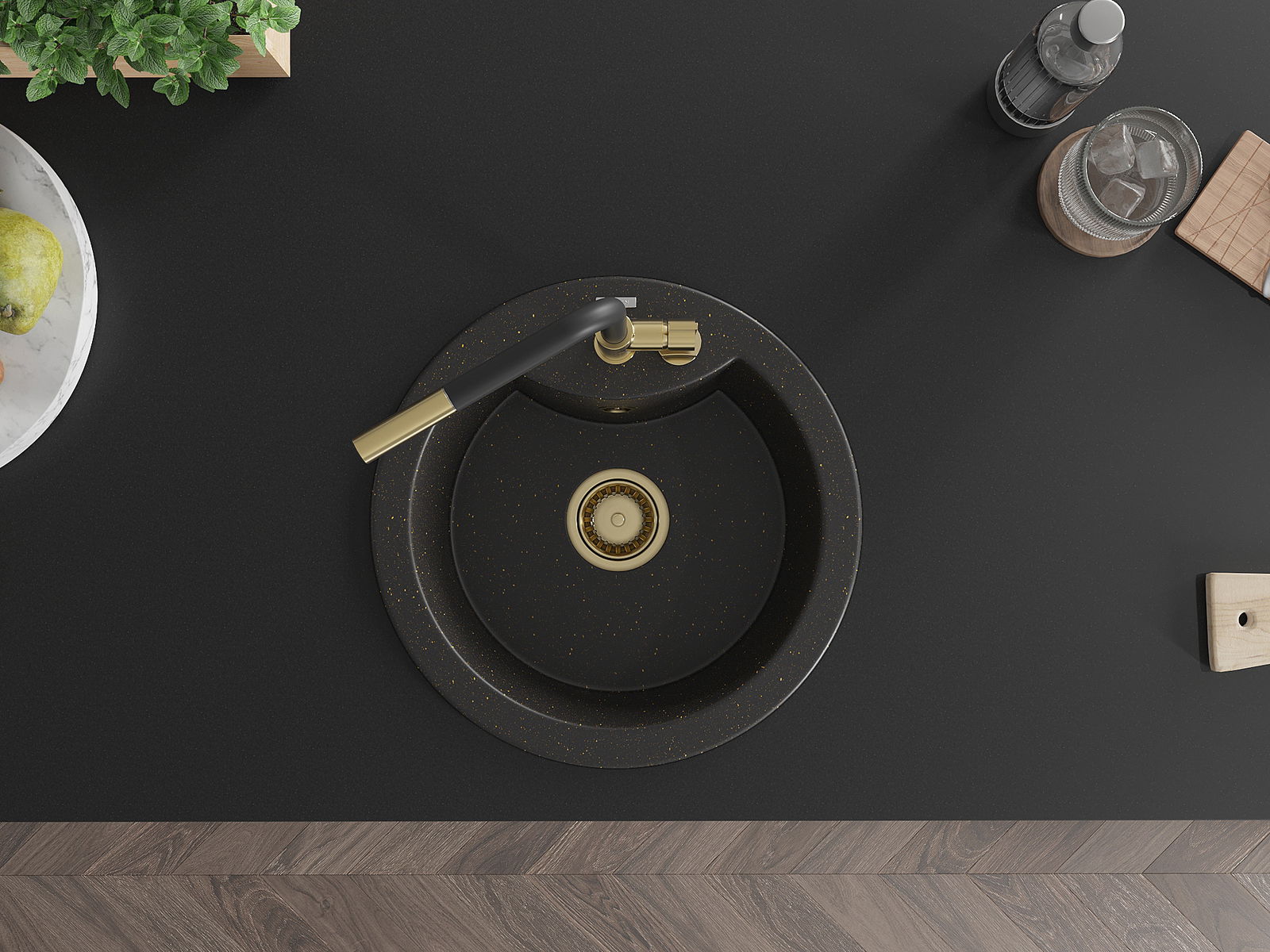 Mexen Diego zlewozmywak granitowy 1-komorowy z baterią kuchenną Flora, czarny/złoty metalik - 6512-75-670401-57-G