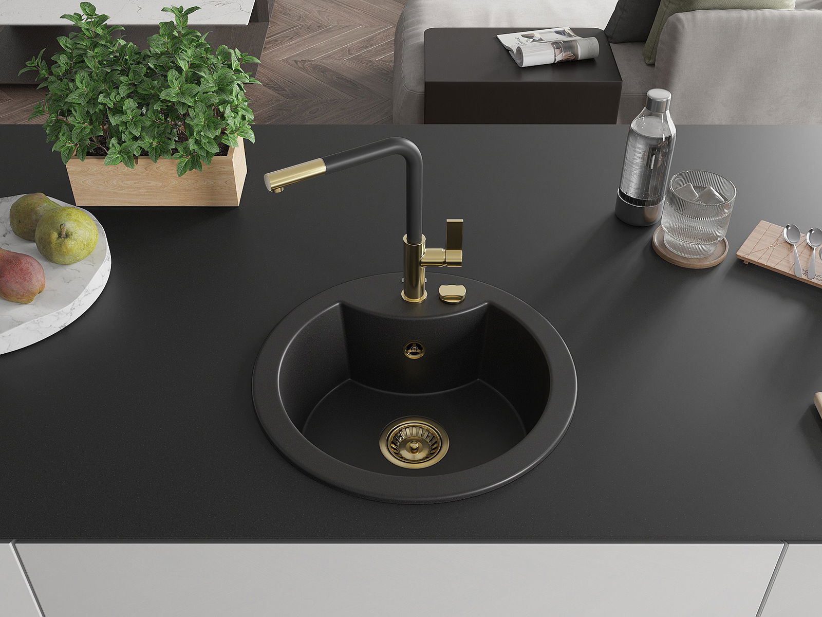 Mexen Diego zlewozmywak granitowy 1-komorowy z baterią kuchenną Flora, czarny - 6512-77-670401-57-G