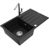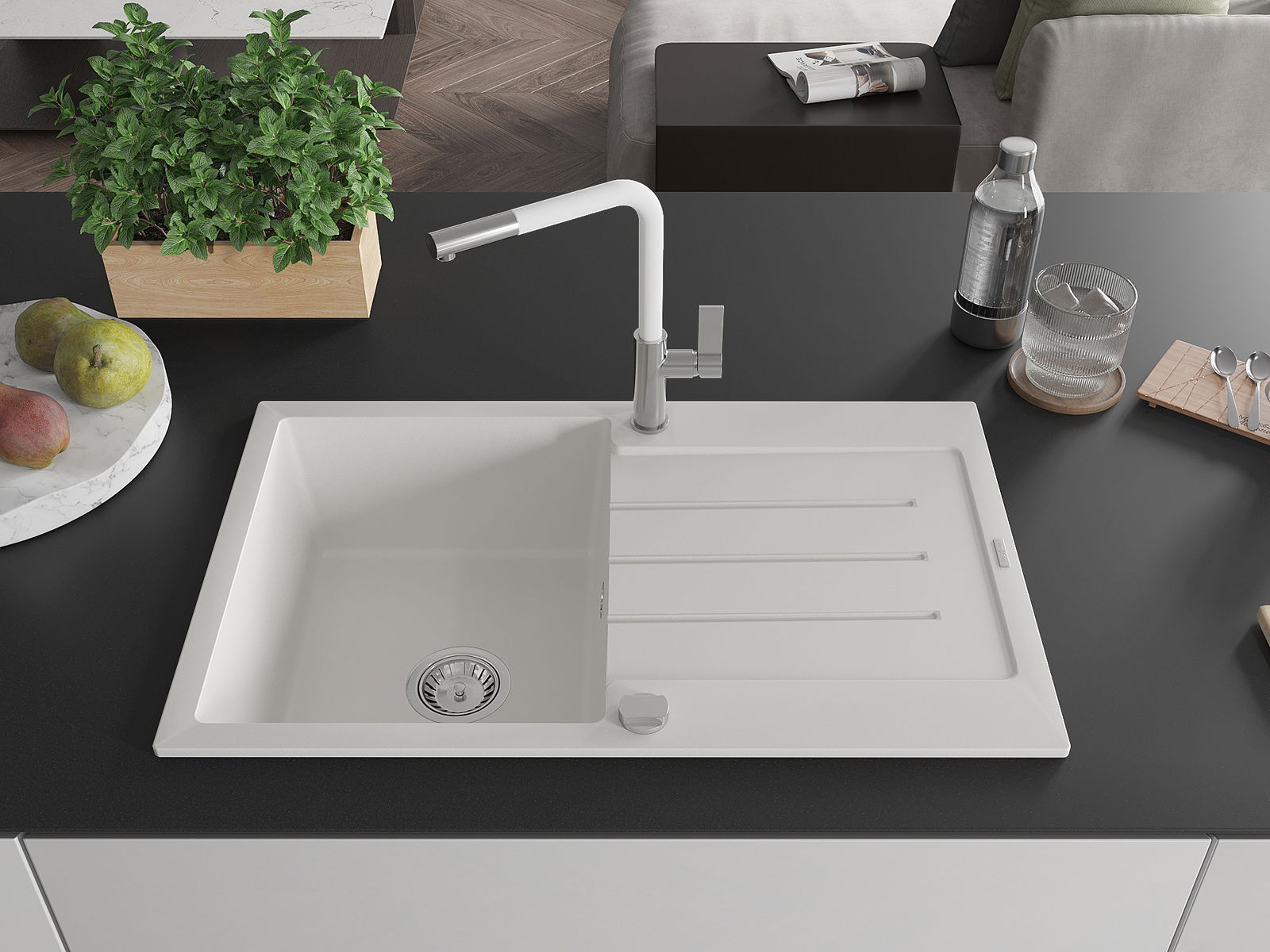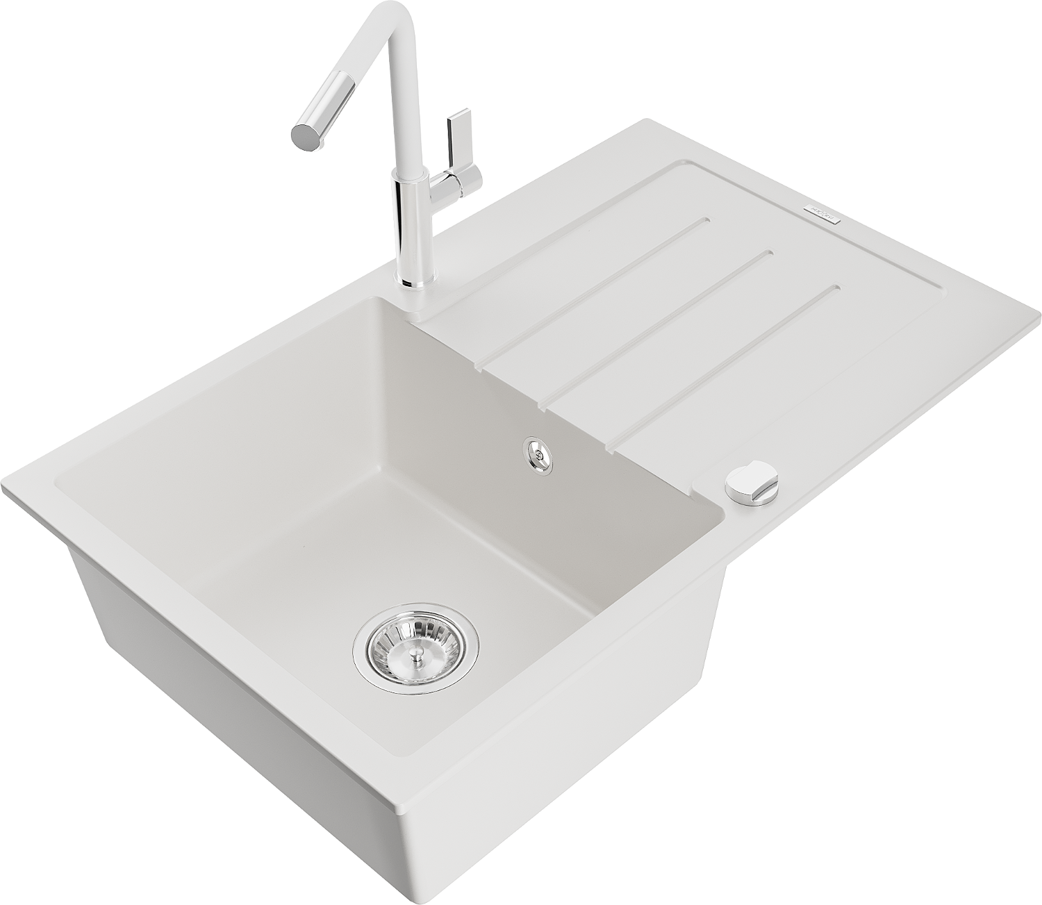 Mexen Bruno zlewozmywak granitowy 1-komorowy z ociekaczem i baterią kuchenną Flora, biały - 6513-20-670401-02