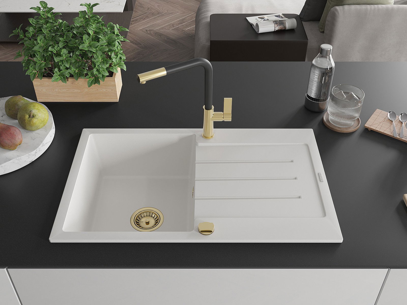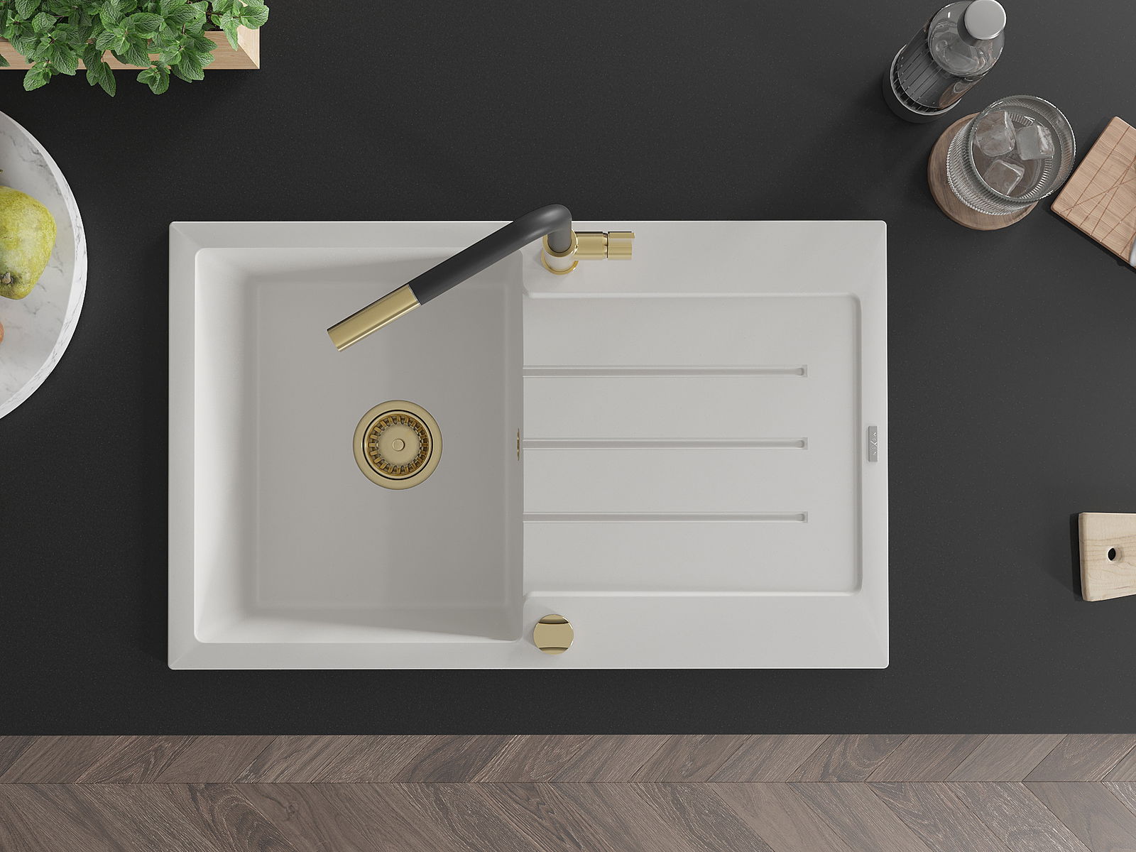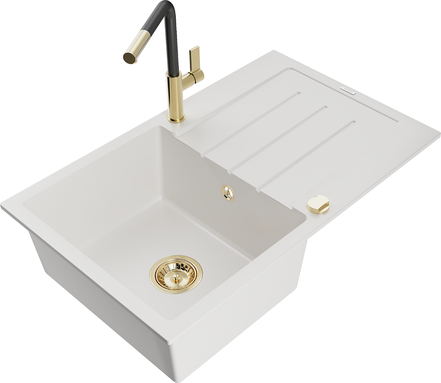 Mexen Bruno zlewozmywak granitowy 1-komorowy z ociekaczem i baterią kuchenną Flora, biały - 6513-20-670401-57-G