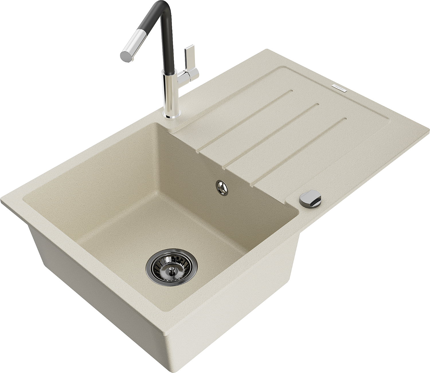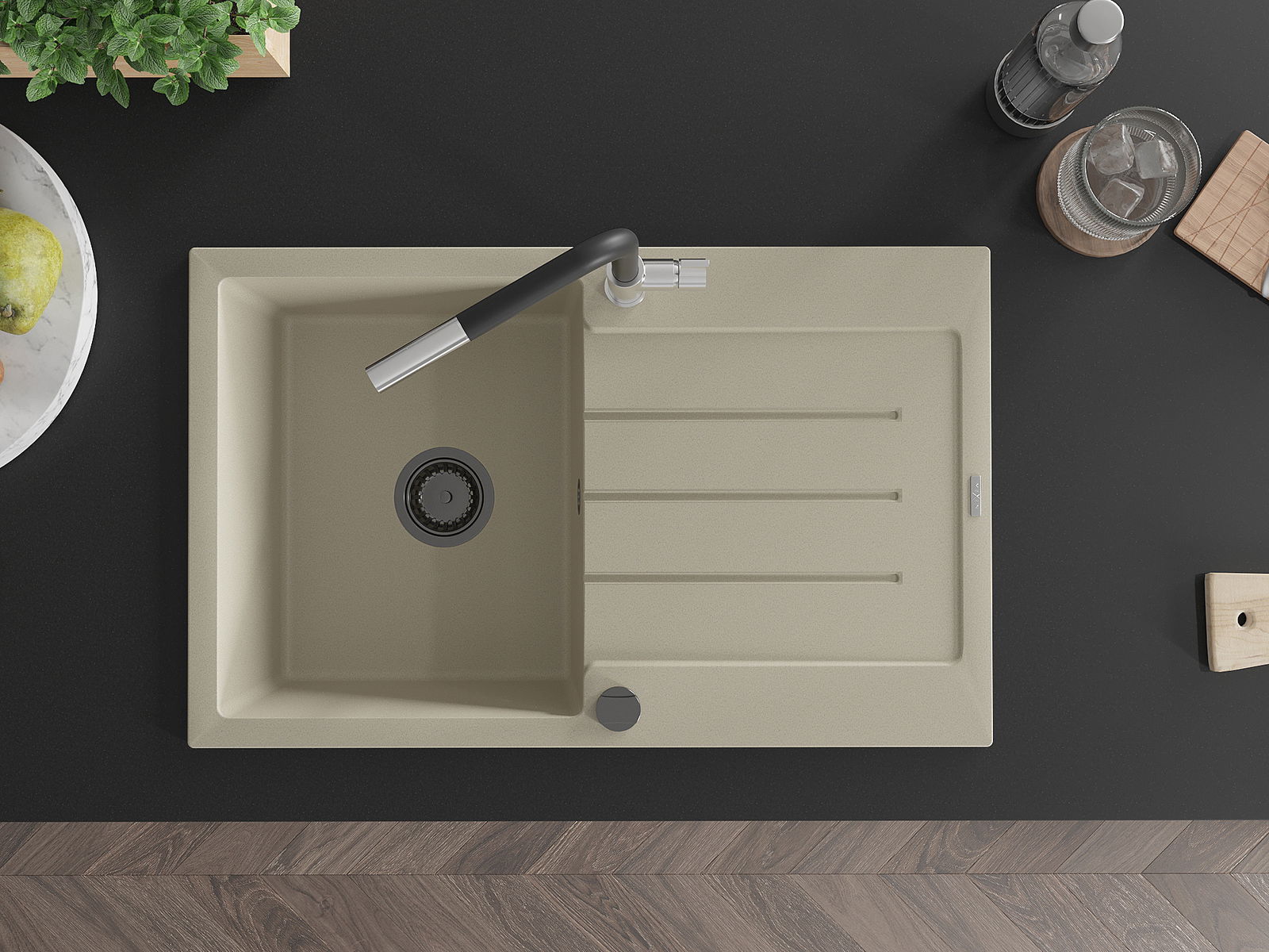 Mexen Bruno zlewozmywak granitowy 1-komorowy z ociekaczem i baterią kuchenną Flora, beżowy - 6513-69-670401-07-B