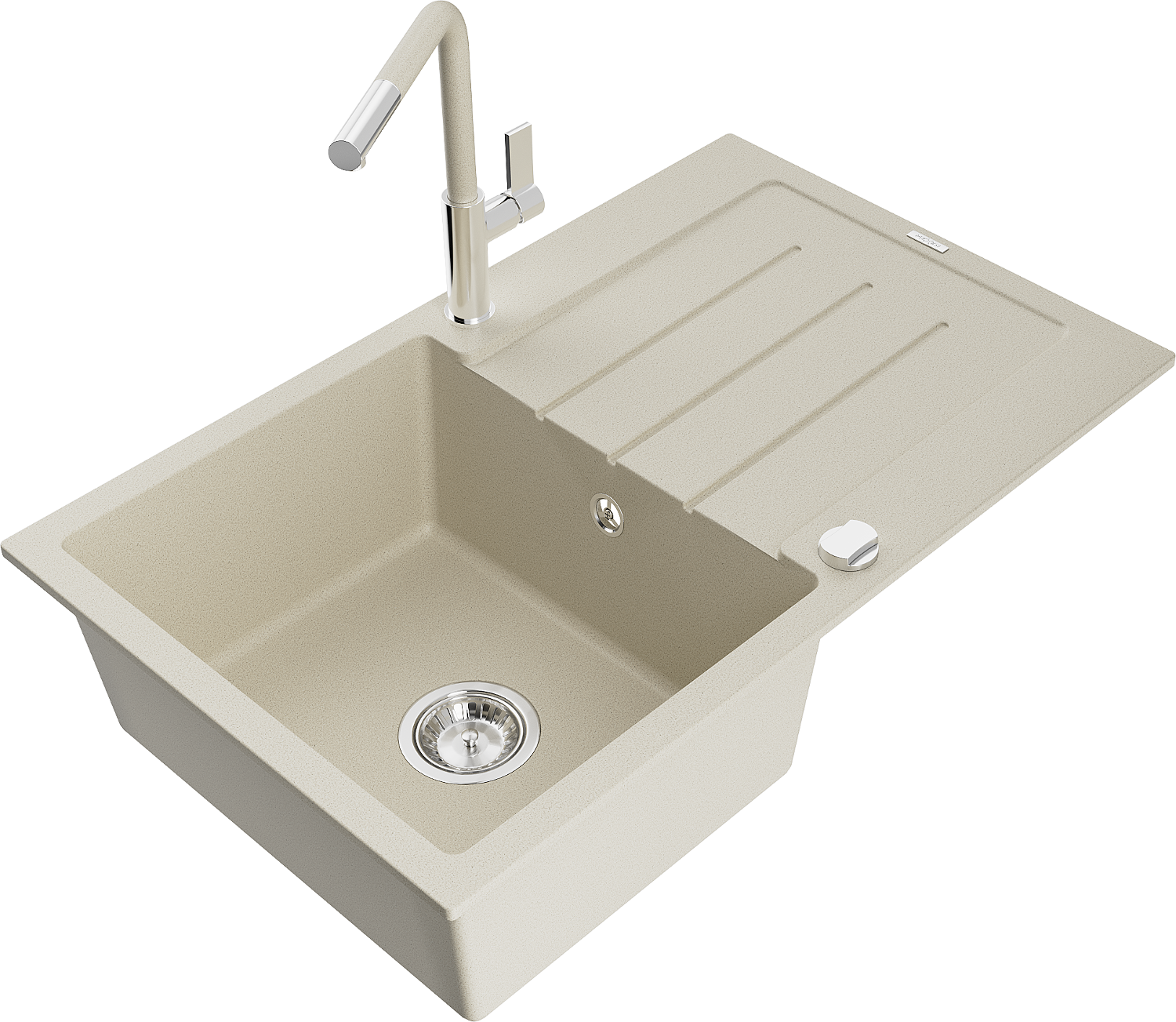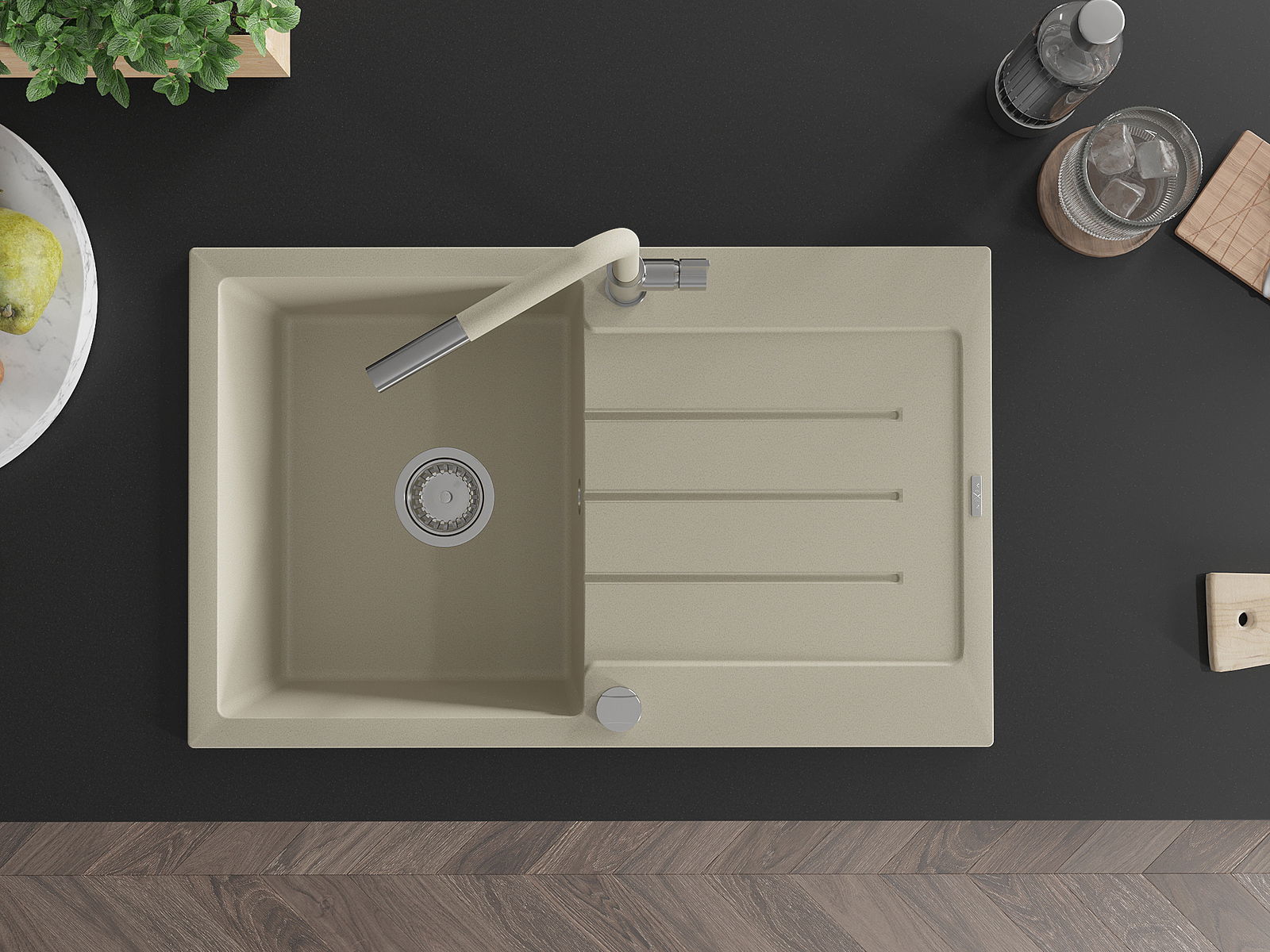 Mexen Bruno zlewozmywak granitowy 1-komorowy z ociekaczem i baterią kuchenną Flora, beżowy - 6513-69-670401-09