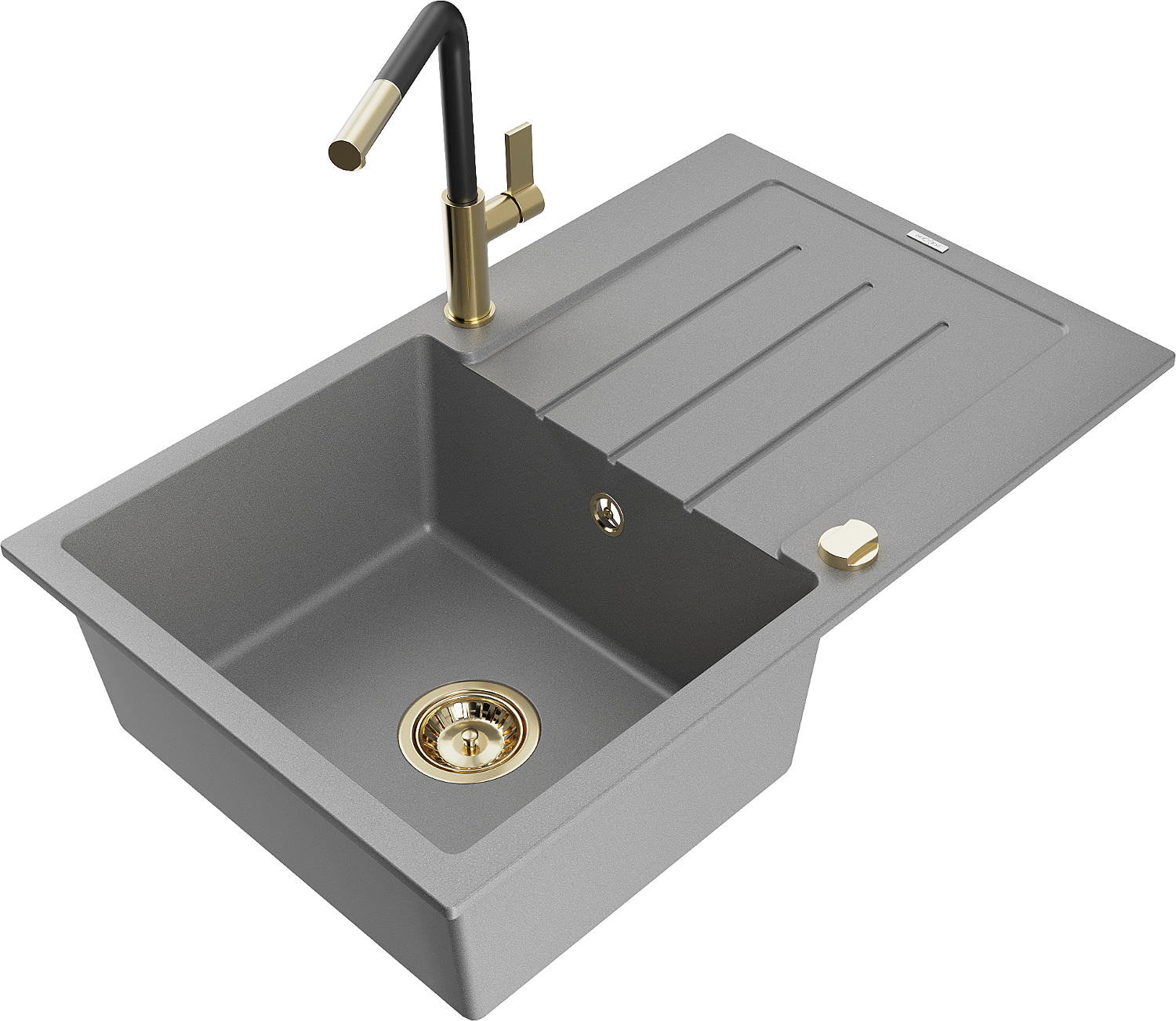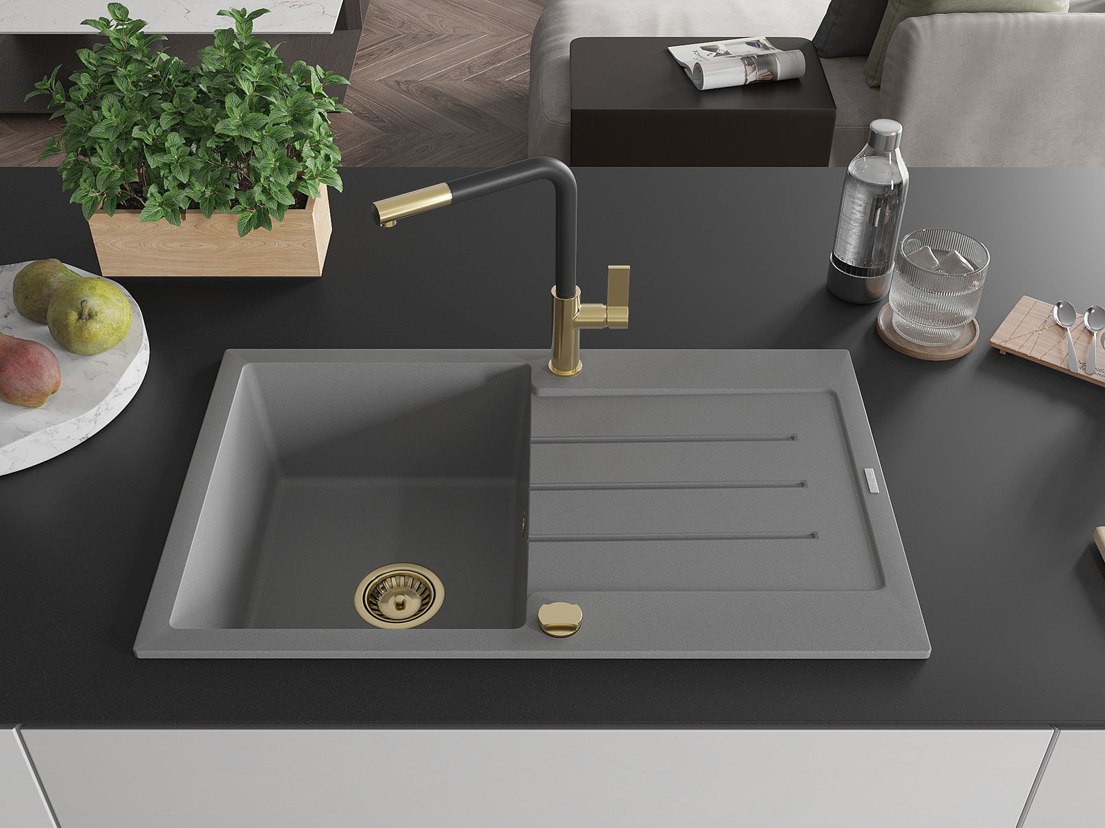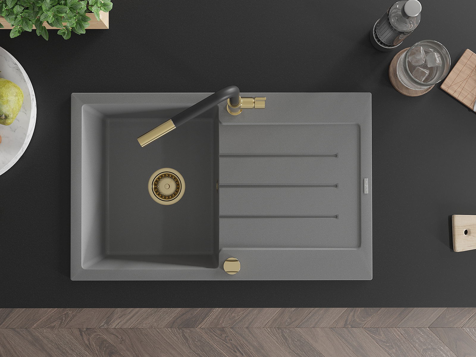 Mexen Bruno zlewozmywak granitowy 1-komorowy z ociekaczem i baterią kuchenną Flora, szary - 6513-71-670401-57-G