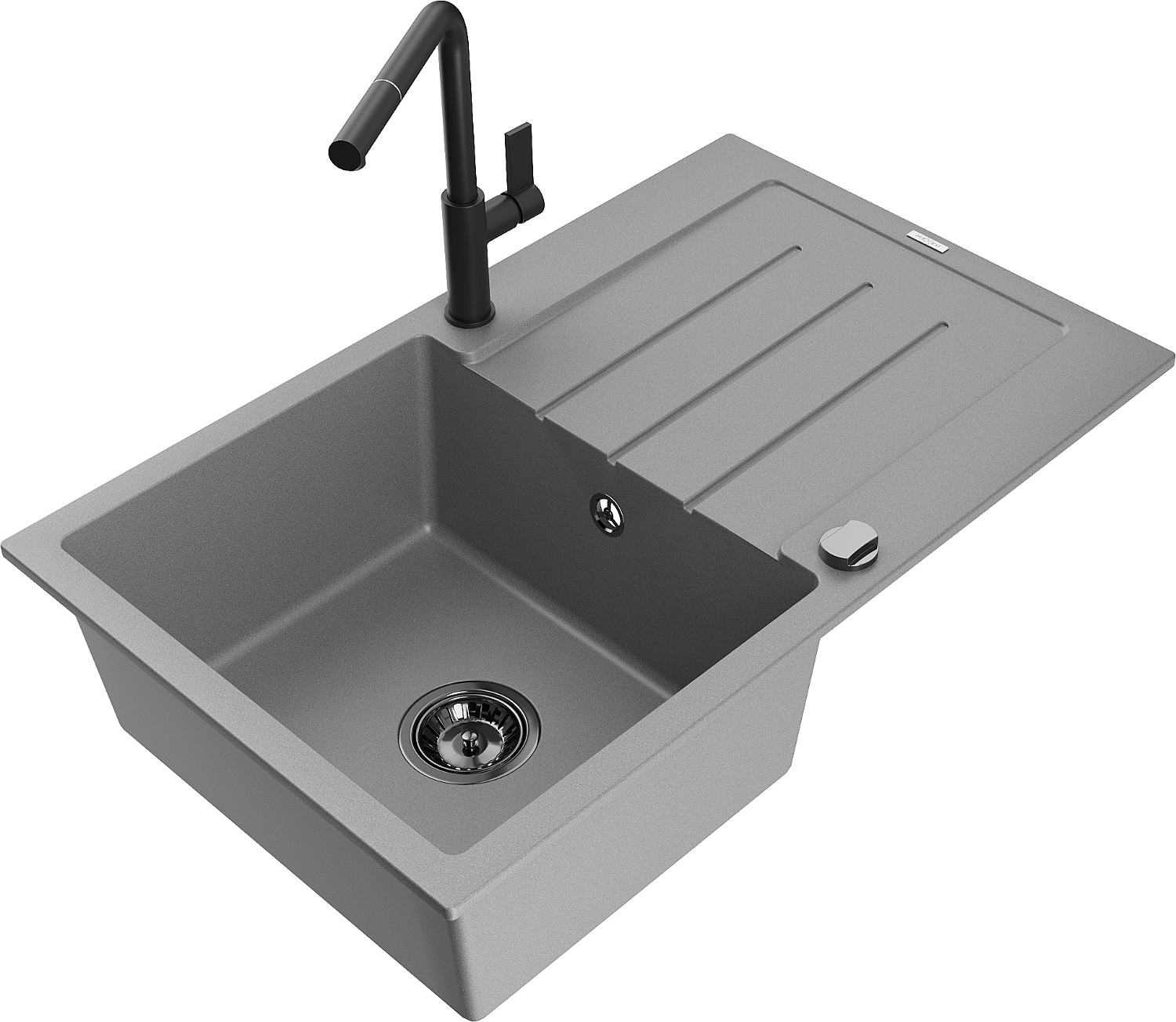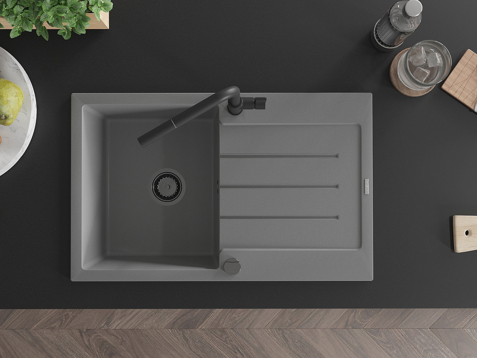 Mexen Bruno zlewozmywak granitowy 1-komorowy z ociekaczem i baterią kuchenną Flora, szary - 6513-71-670401-70-B