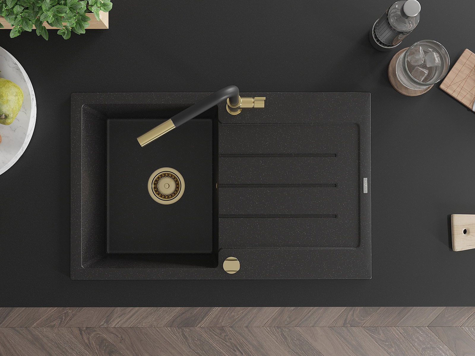 Mexen Bruno zlewozmywak granitowy 1-komorowy z ociekaczem i baterią kuchenną Flora, czarny/srebrny metalik - 6513-73-670401-57-G