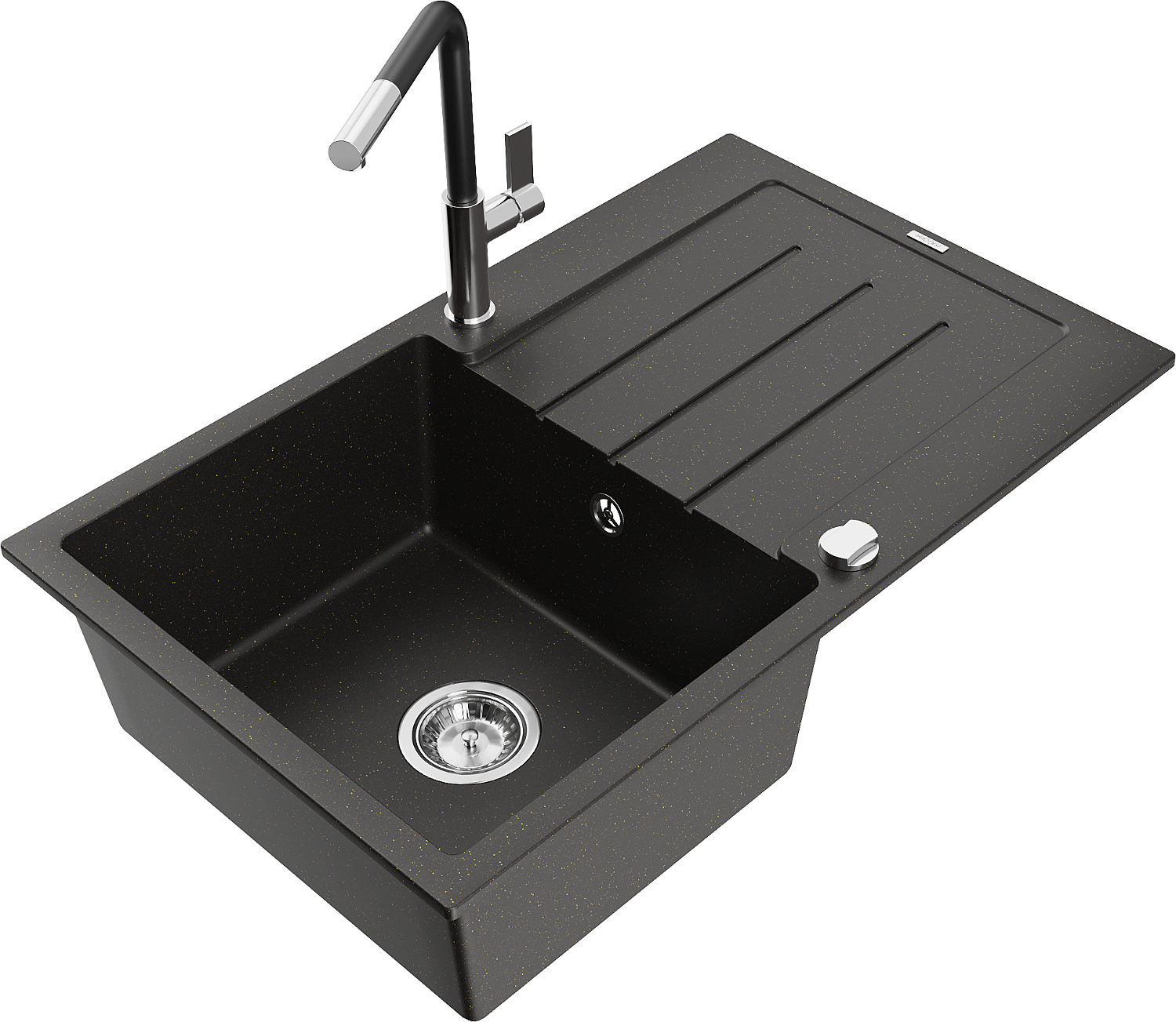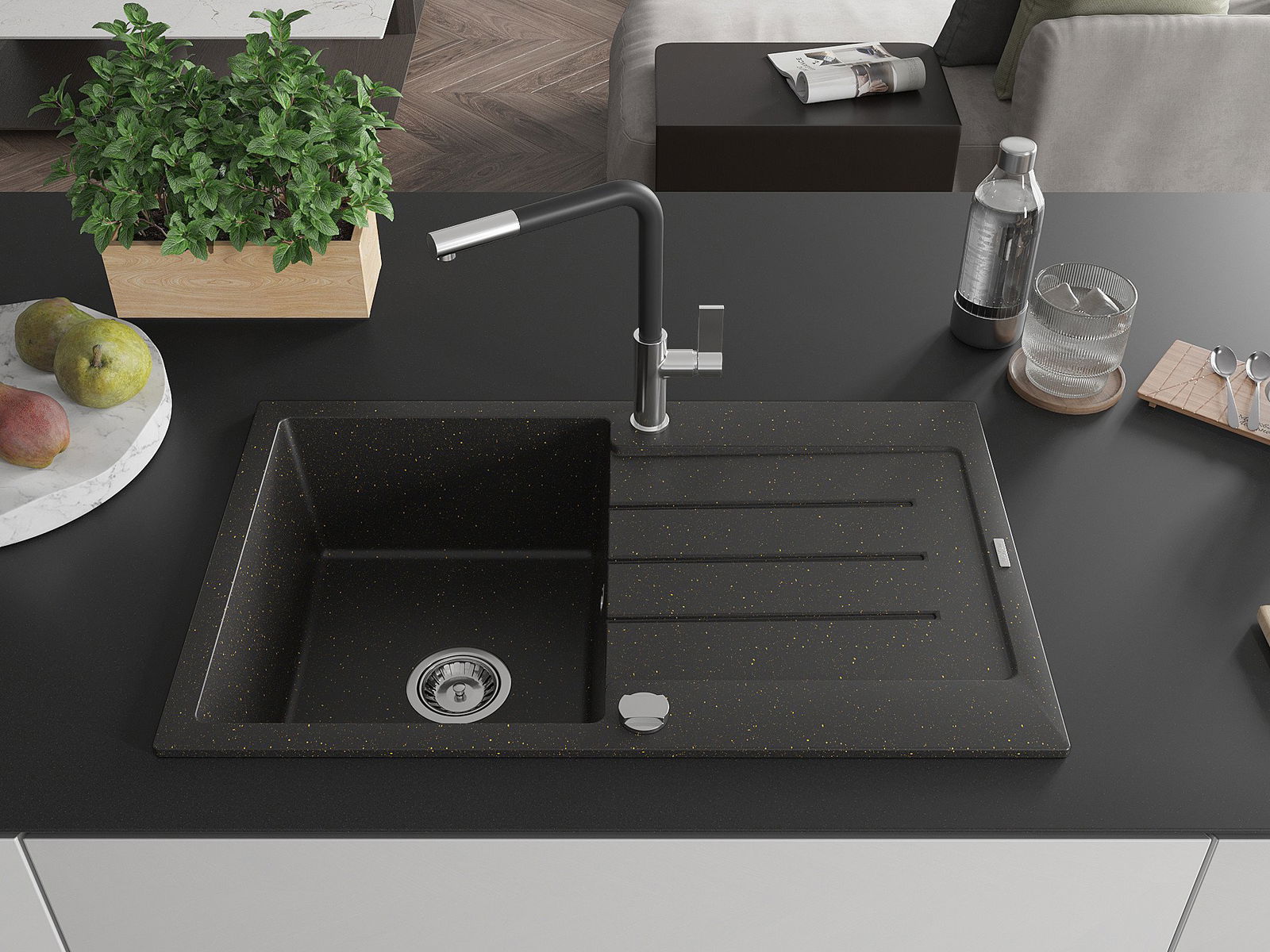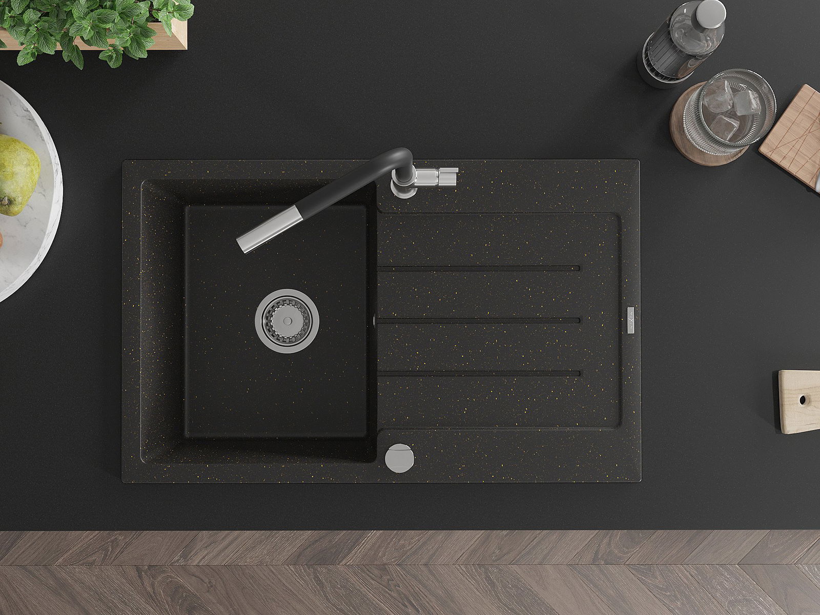 Mexen Bruno zlewozmywak granitowy 1-komorowy z ociekaczem i baterią kuchenną Flora, czarny/złoty metalik - 6513-75-670401-07