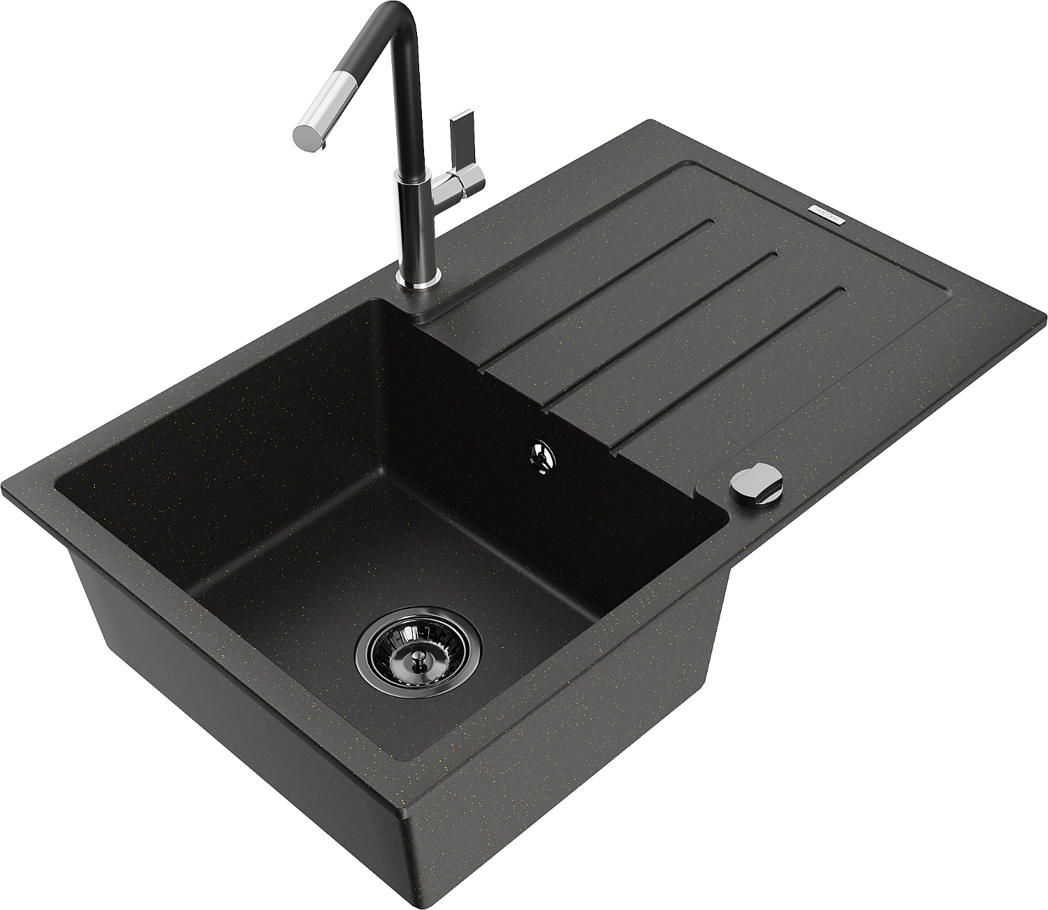 Mexen Bruno zlewozmywak granitowy 1-komorowy z ociekaczem i baterią kuchenną Flora, czarny/złoty metalik - 6513-75-670401-07-B