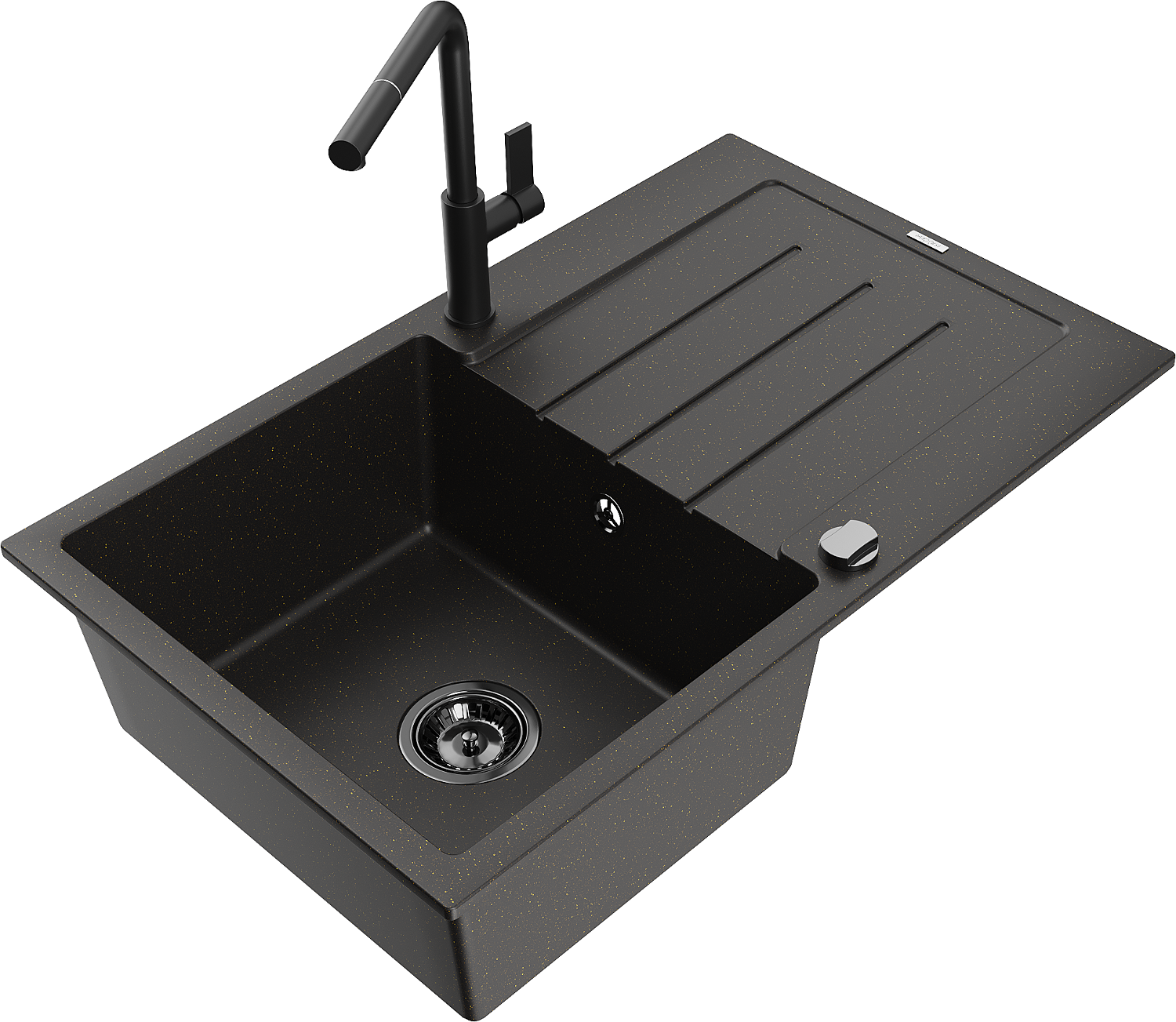 Mexen Bruno zlewozmywak granitowy 1-komorowy z ociekaczem i baterią kuchenną Flora, czarny/złoty metalik - 6513-75-670401-70-B