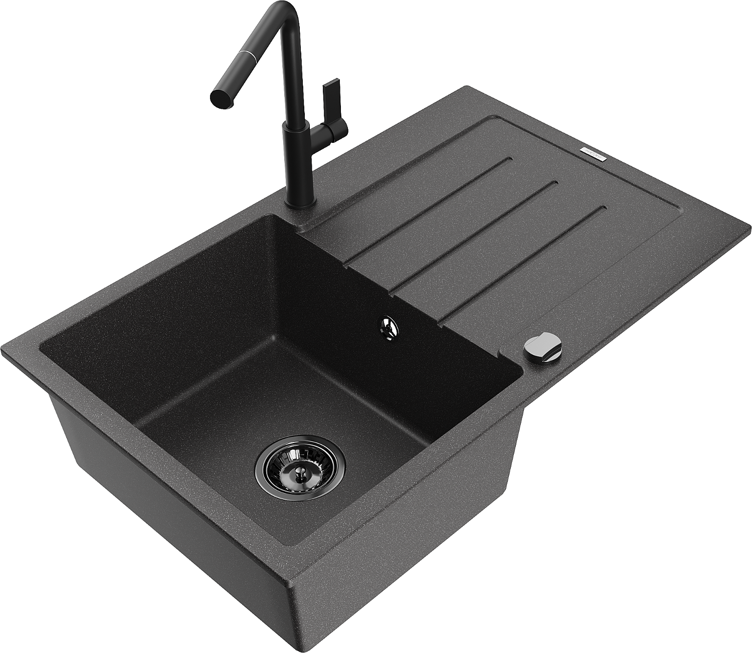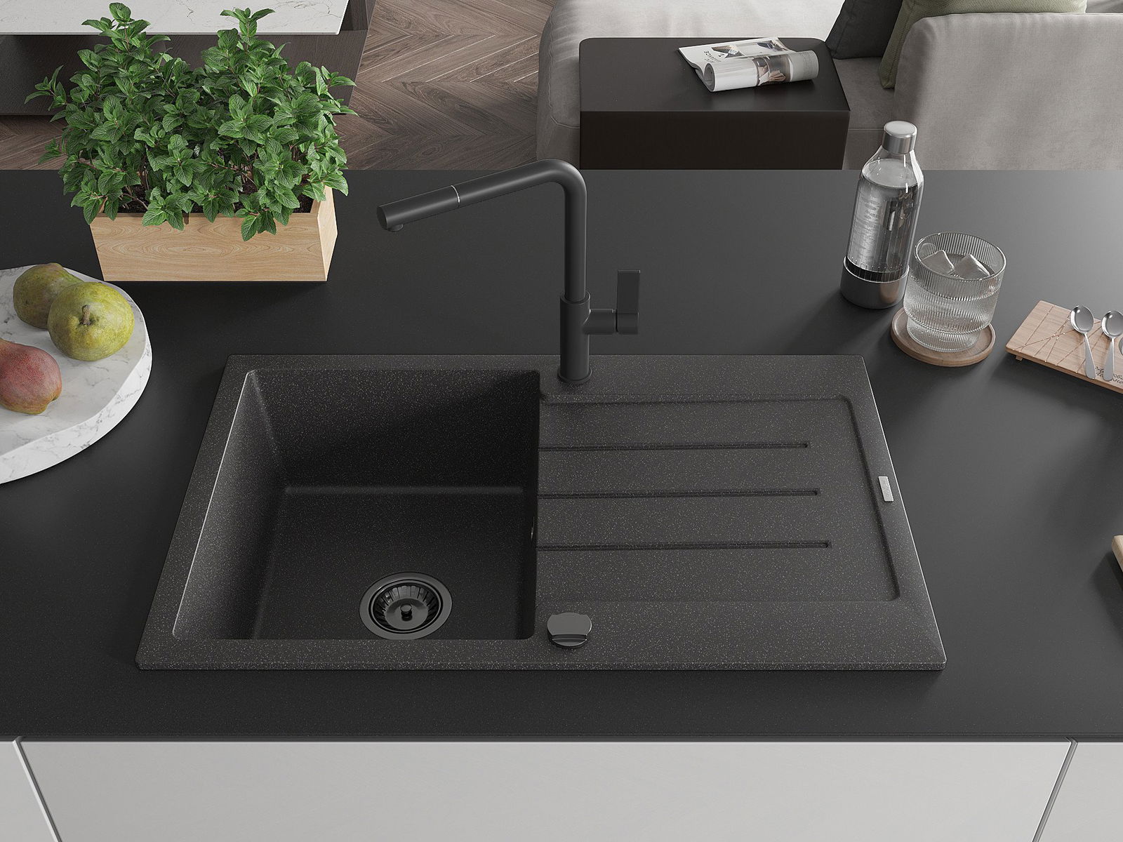 Mexen Bruno zlewozmywak granitowy 1-komorowy z ociekaczem i baterią kuchenną Flora, czarny nakrapiany - 6513-76-670401-70-B