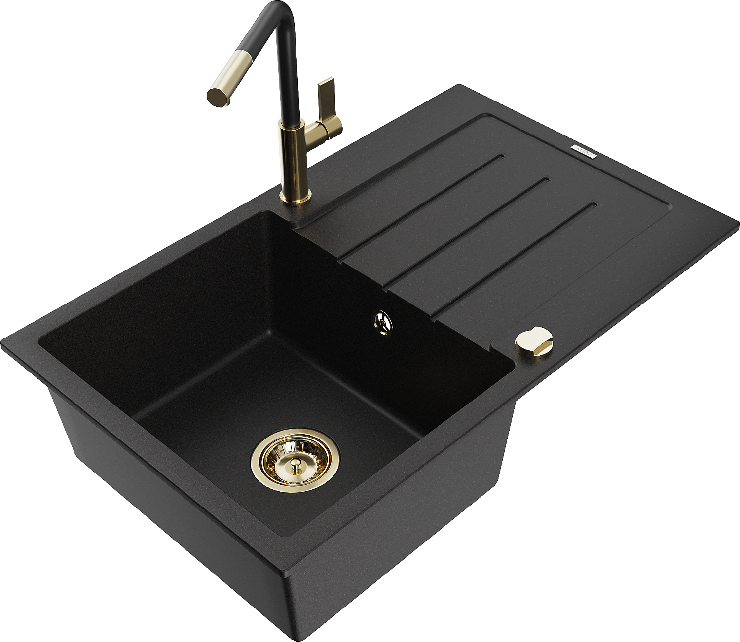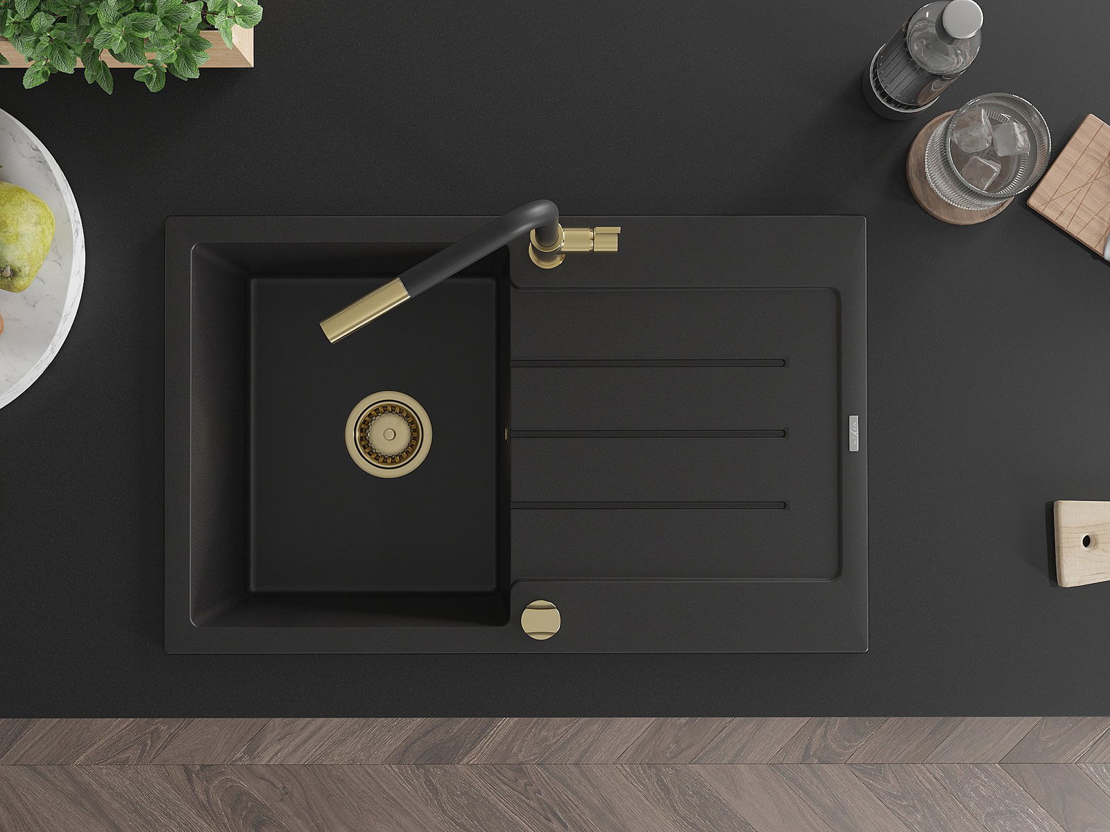 Mexen Bruno zlewozmywak granitowy 1-komorowy z ociekaczem i baterią kuchenną Flora, czarny - 6513-77-670401-57-G