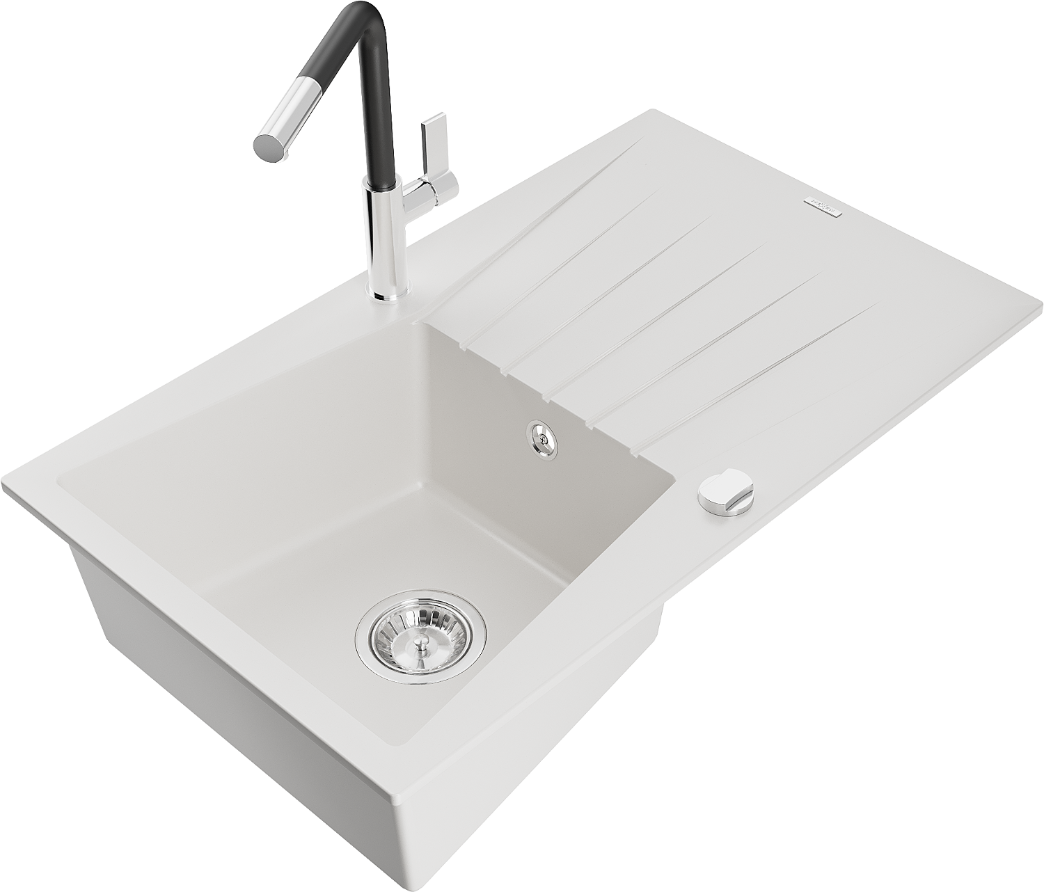 Mexen Cesar zlewozmywak granitowy 1-komorowy z ociekaczem i baterią kuchenną Flora, biały - 6514-20-670401-07