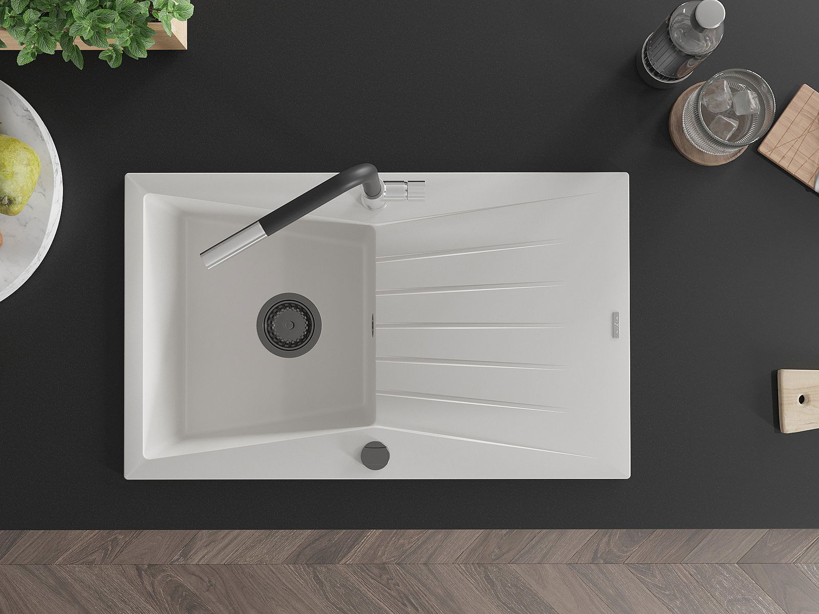 Mexen Cesar zlewozmywak granitowy 1-komorowy z ociekaczem i baterią kuchenną Flora, biały - 6514-20-670401-07-B