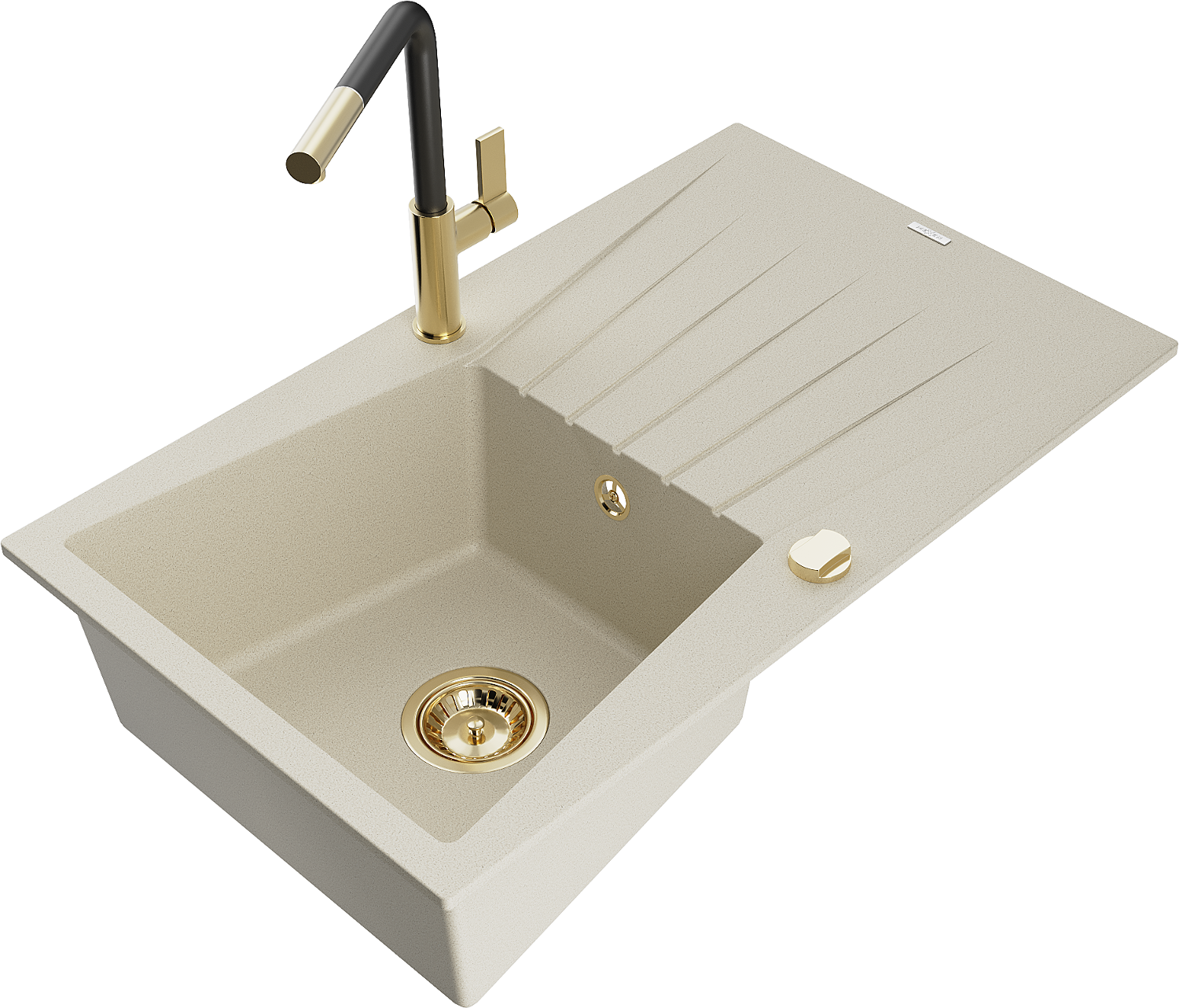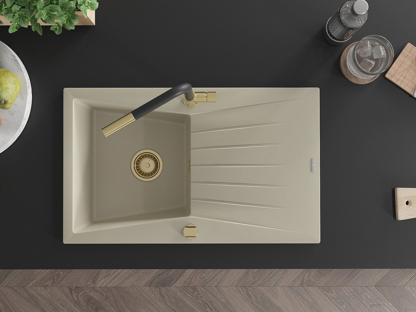 Mexen Cesar zlewozmywak granitowy 1-komorowy z ociekaczem i baterią kuchenną Flora, beżowy - 6514-69-670401-57-G