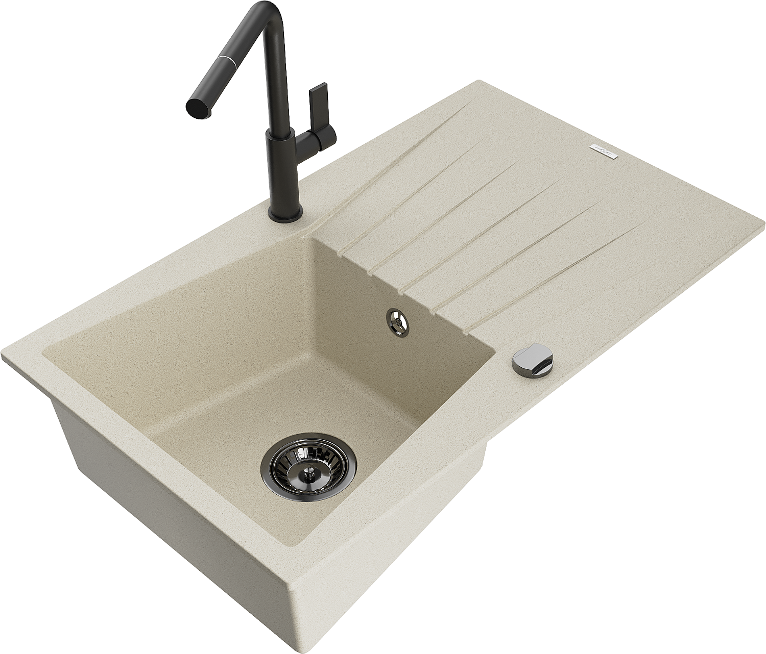 Mexen Cesar zlewozmywak granitowy 1-komorowy z ociekaczem i baterią kuchenną Flora, beżowy - 6514-69-670401-70-B