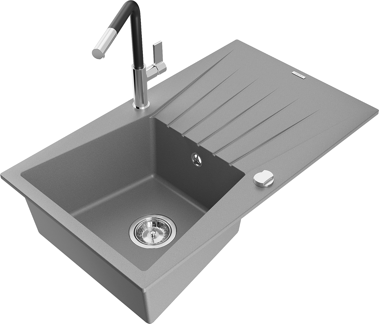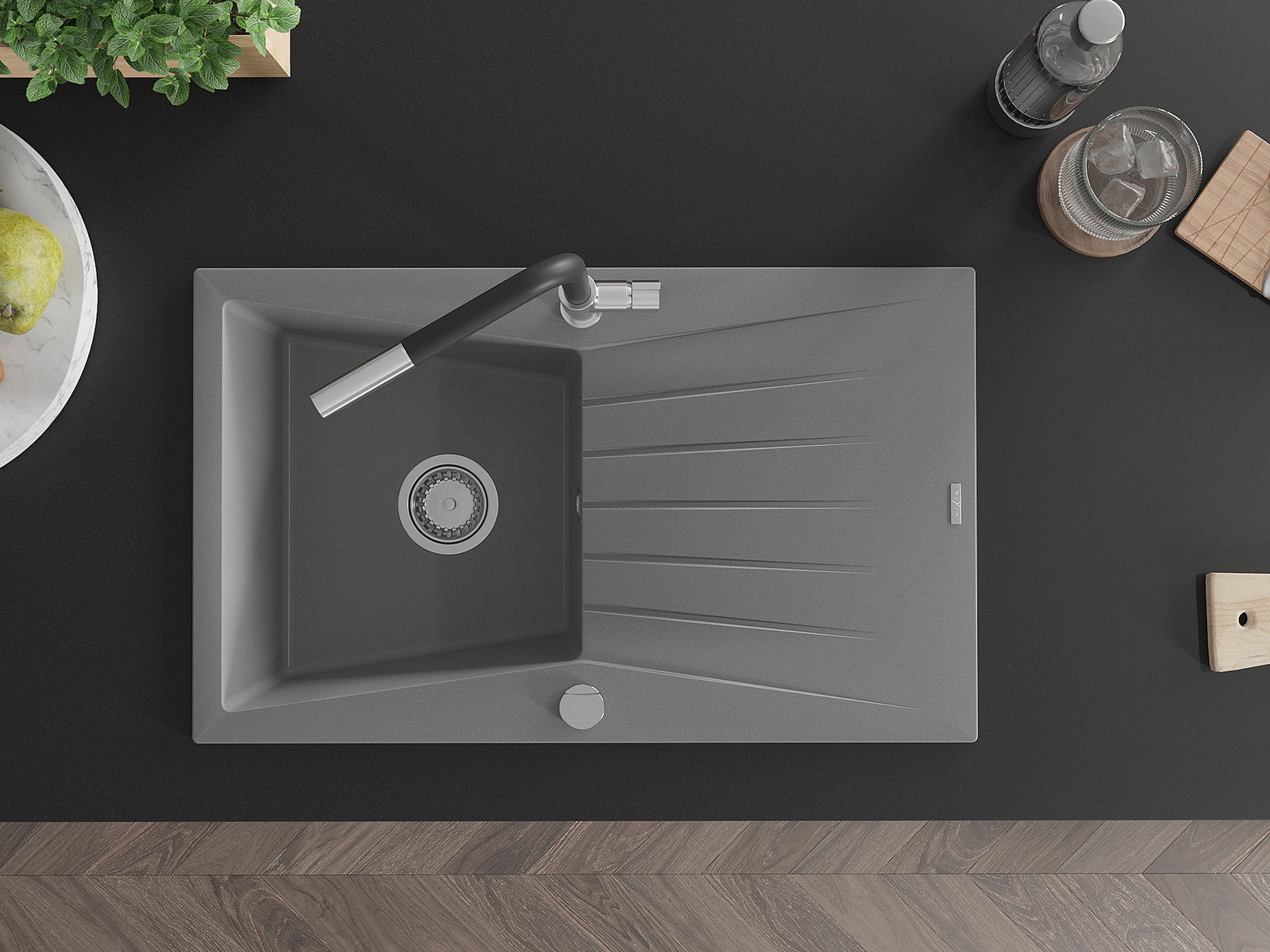 Mexen Cesar zlewozmywak granitowy 1-komorowy z ociekaczem i baterią kuchenną Flora, szary - 6514-71-670401-07
