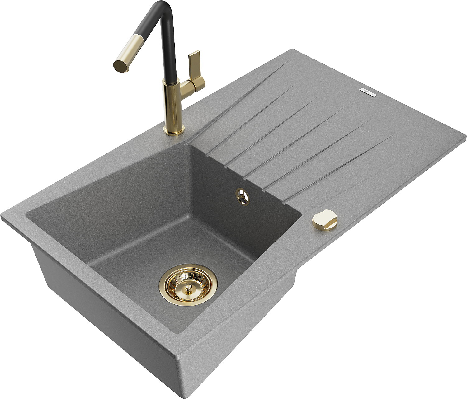 Mexen Cesar zlewozmywak granitowy 1-komorowy z ociekaczem i baterią kuchenną Flora, szary - 6514-71-670401-57-G