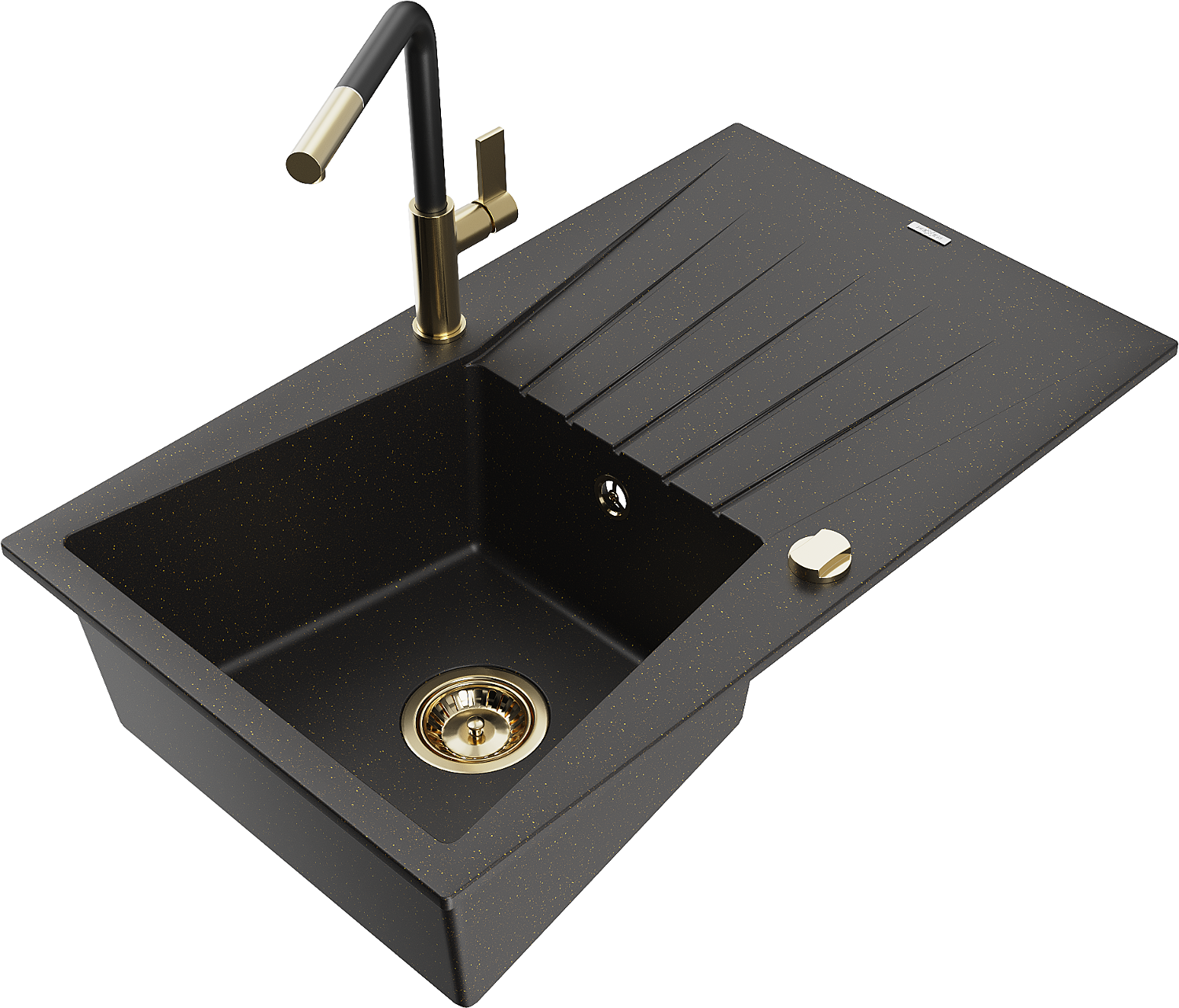 Mexen Cesar zlewozmywak granitowy 1-komorowy z ociekaczem i baterią kuchenną Flora, czarny/złoty metalik - 6514-75-670401-57-G