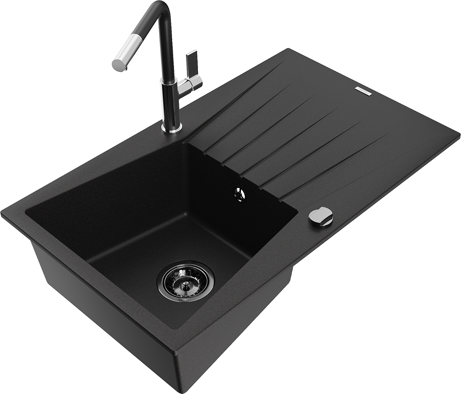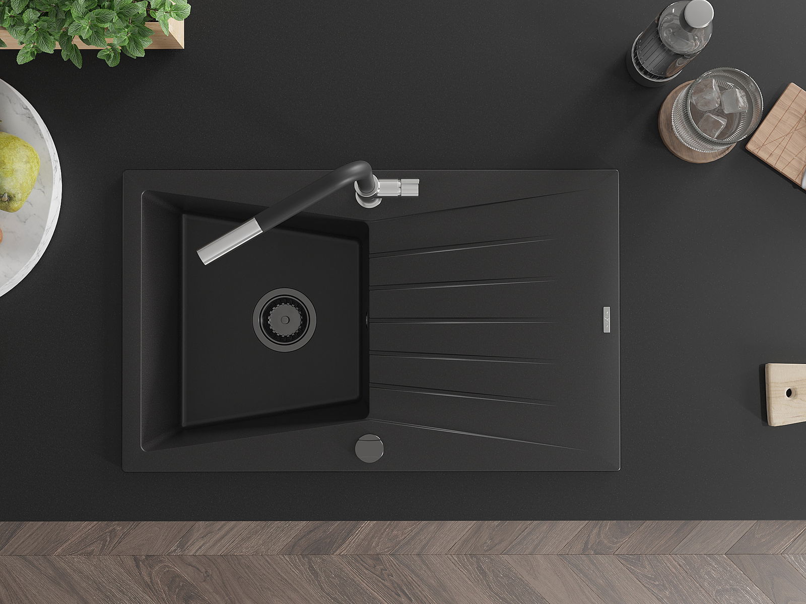 Mexen Cesar zlewozmywak granitowy 1-komorowy z ociekaczem i baterią kuchenną Flora, czarny - 6514-77-670401-07-B