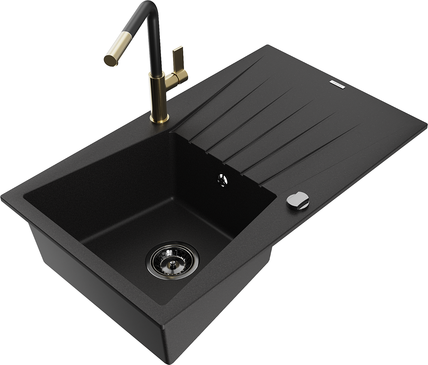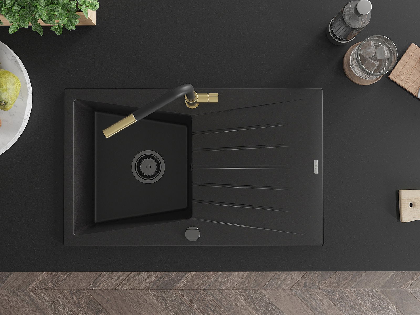 Mexen Cesar zlewozmywak granitowy 1-komorowy z ociekaczem i baterią kuchenną Flora, czarny - 6514-77-670401-57-B
