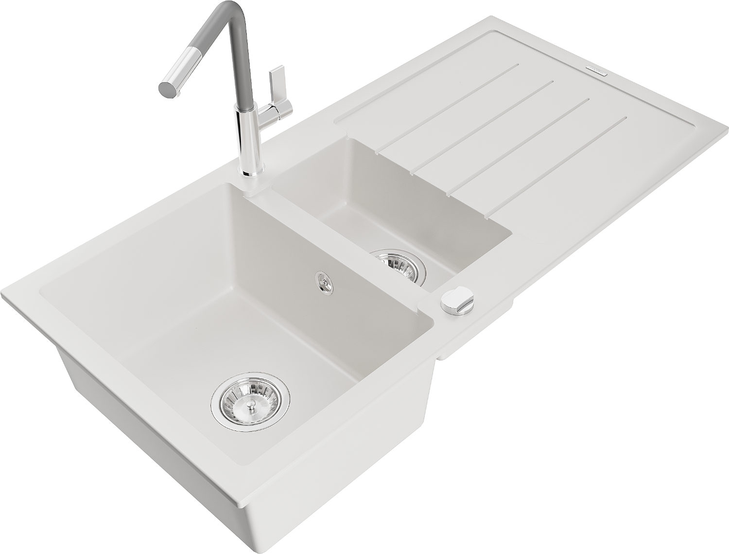 Mexen Andres zlewozmywak granitowy 1,5-komorowy z ociekaczem i baterią kuchenną Flora, biały - 6515-20-670401-06