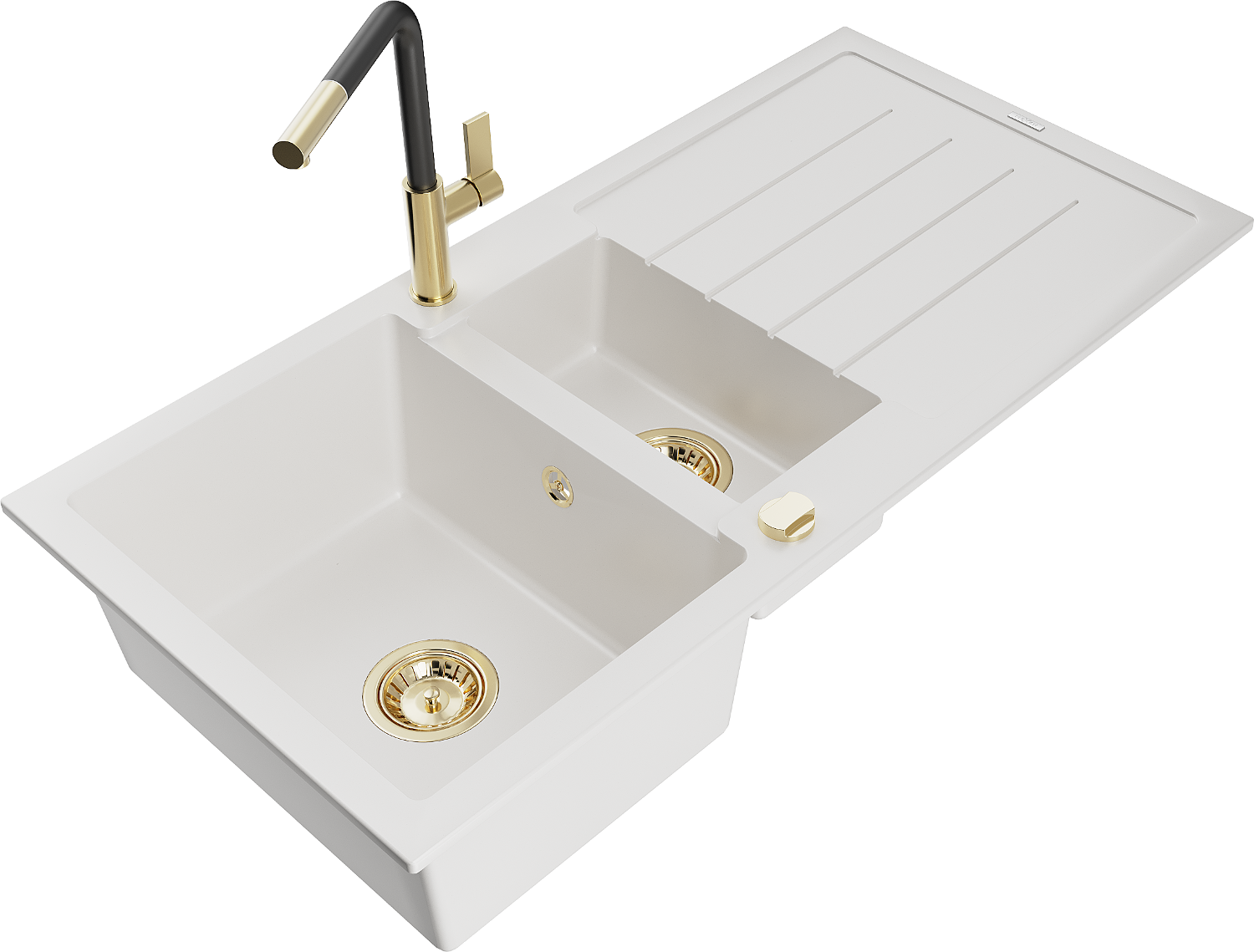 Mexen Andres zlewozmywak granitowy 1,5-komorowy z ociekaczem i baterią kuchenną Flora, biały - 6515-20-670401-57-G