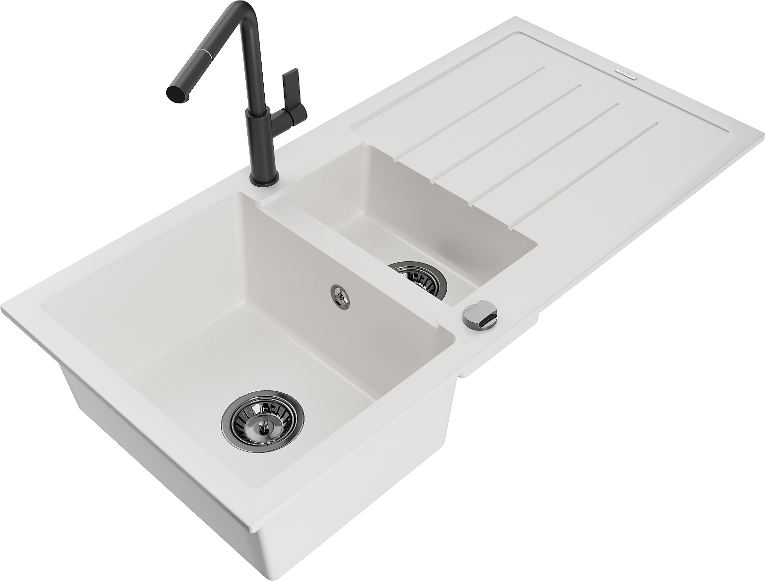 Mexen Andres zlewozmywak granitowy 1,5-komorowy z ociekaczem i baterią kuchenną Flora, biały - 6515-20-670401-70-B