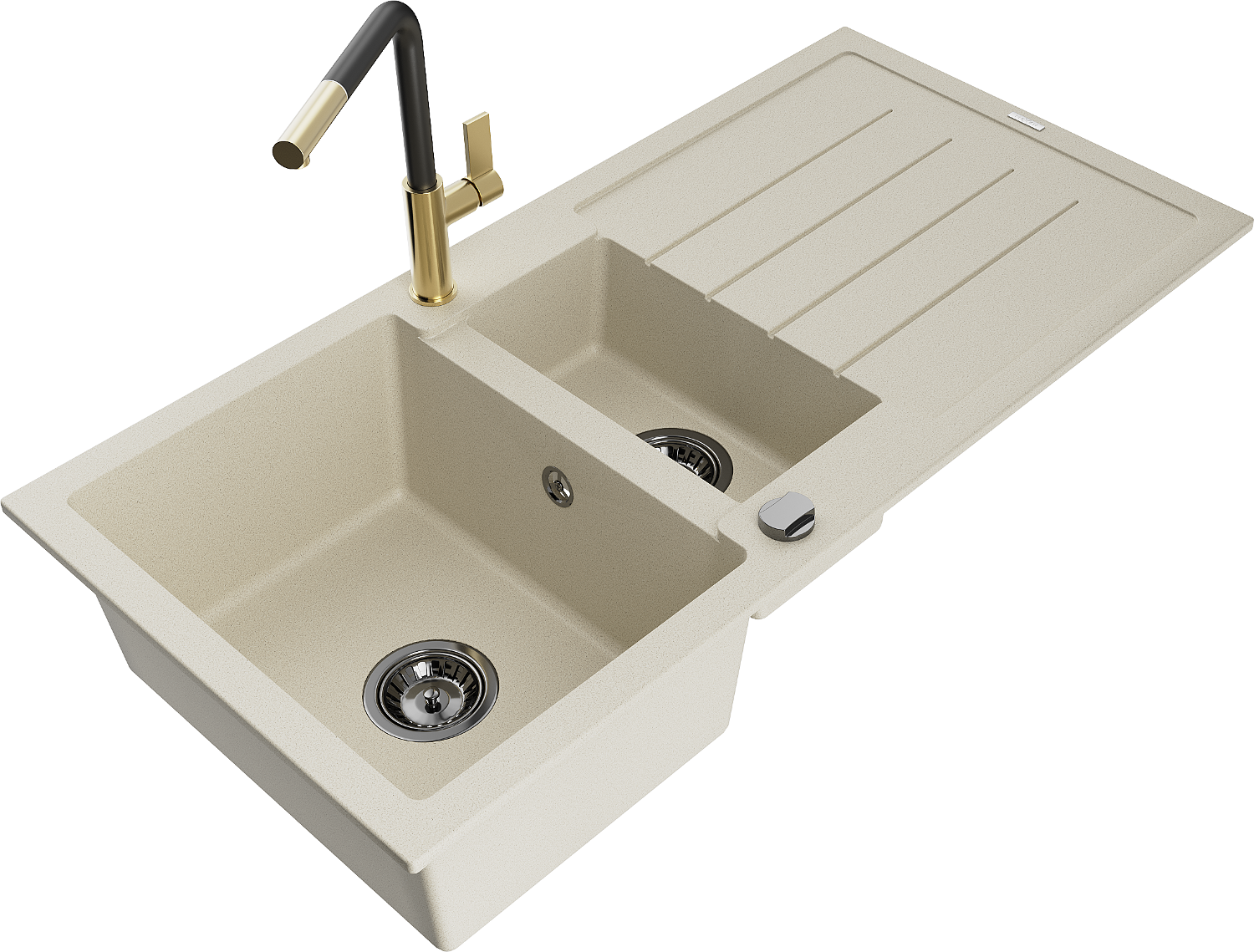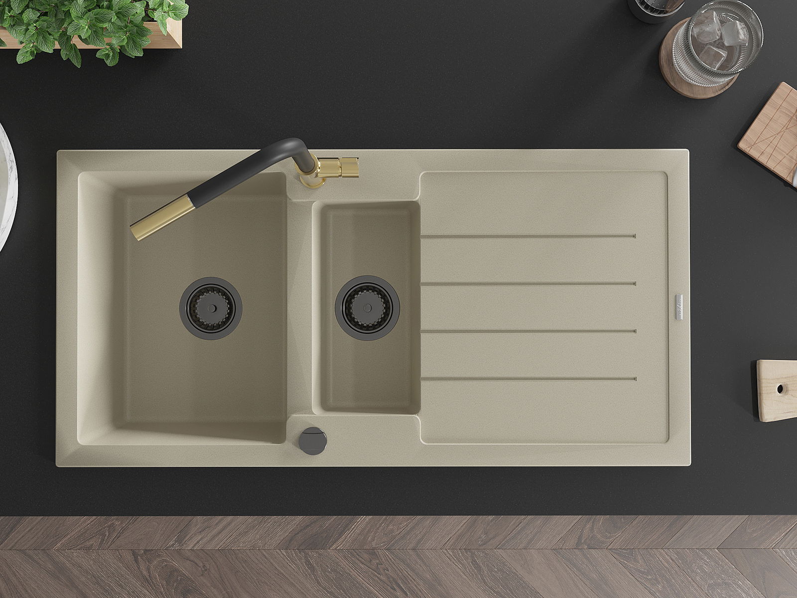 Mexen Andres zlewozmywak granitowy 1,5-komorowy z ociekaczem i baterią kuchenną Flora, beżowy - 6515-69-670401-57-B