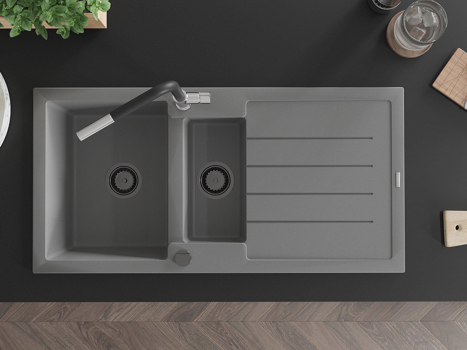 Mexen Andres zlewozmywak granitowy 1,5-komorowy z ociekaczem i baterią kuchenną Flora, szary - 6515-71-670401-07-B