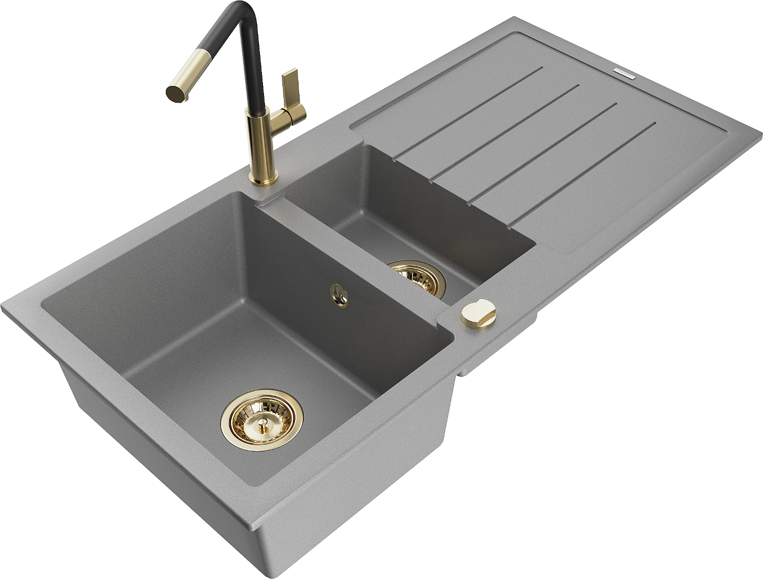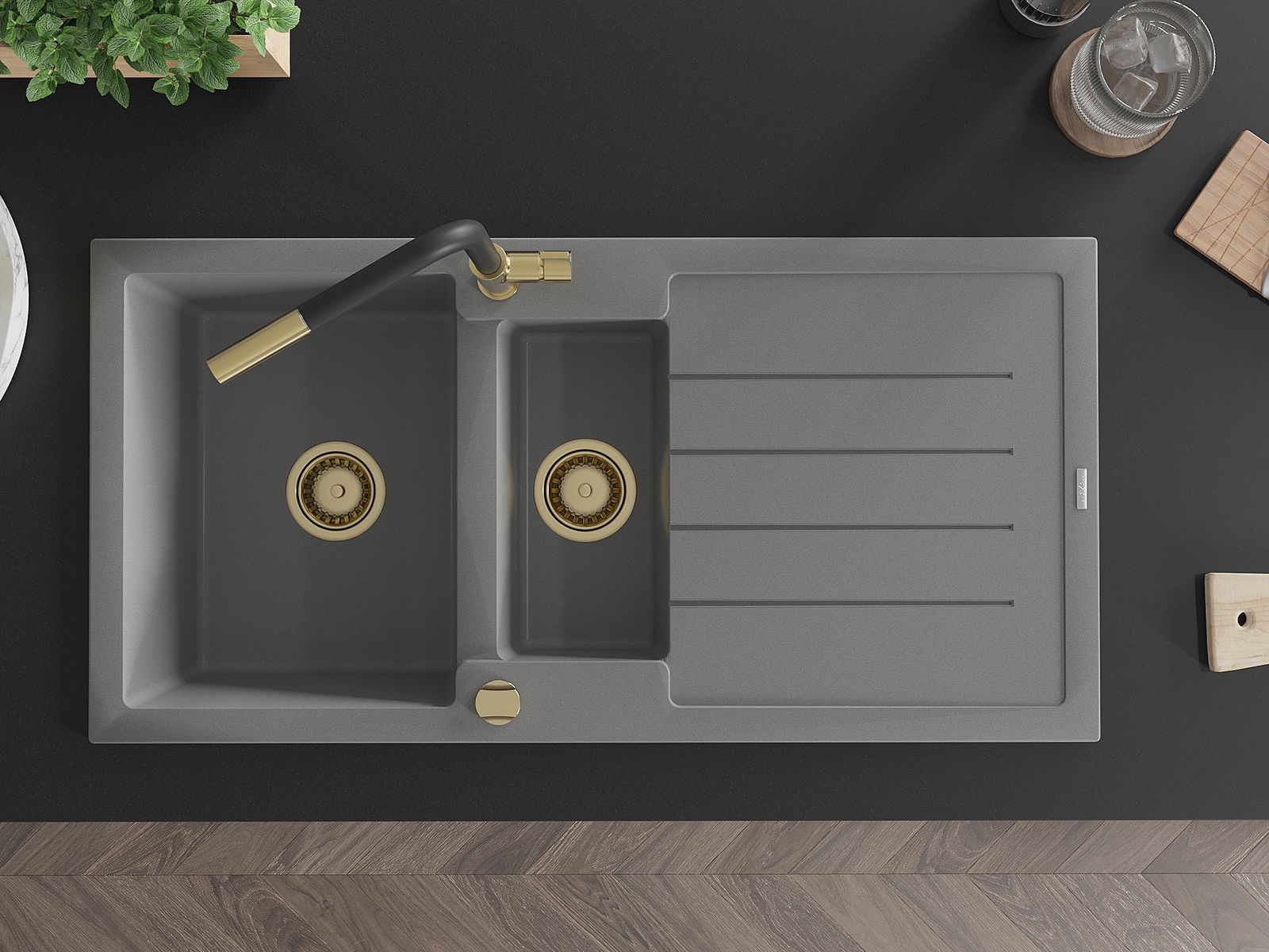 Mexen Andres zlewozmywak granitowy 1,5-komorowy z ociekaczem i baterią kuchenną Flora, szary - 6515-71-670401-57-G