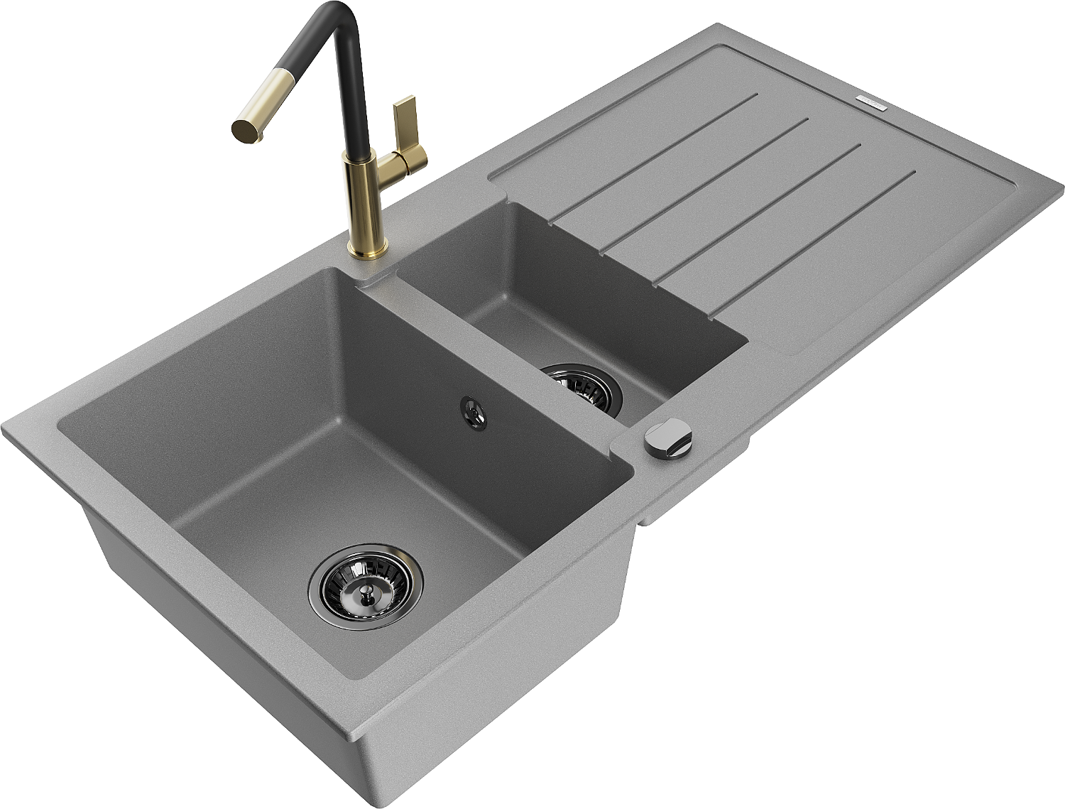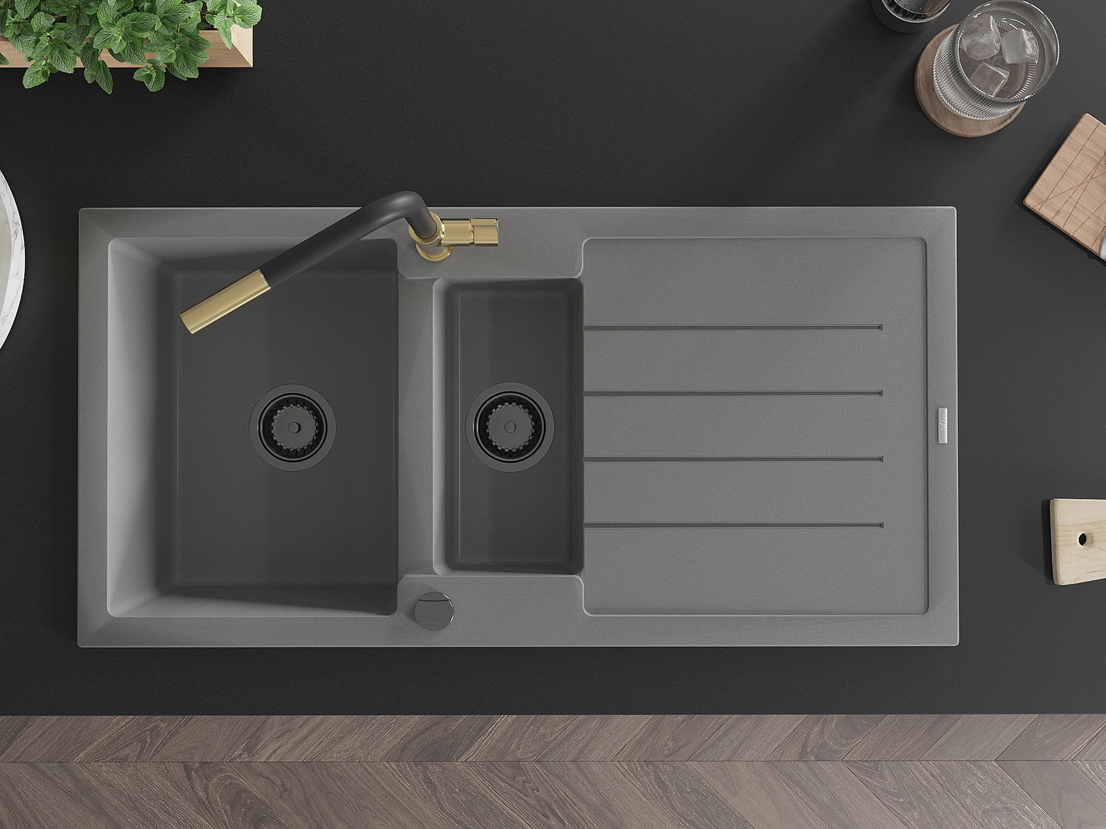 Mexen Andres zlewozmywak granitowy 1,5-komorowy z ociekaczem i baterią kuchenną Flora, szary - 6515-71-670401-57-B