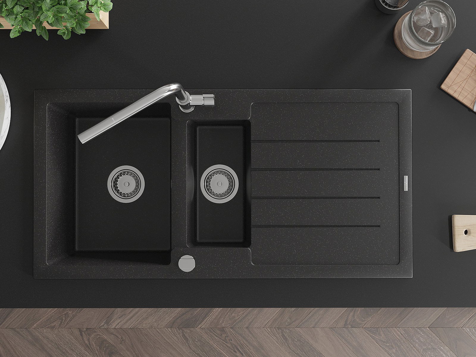 Mexen Andres zlewozmywak granitowy 1,5-komorowy z ociekaczem i baterią kuchenną Flora, czarny/srebrny - 6515-73-670401-00