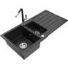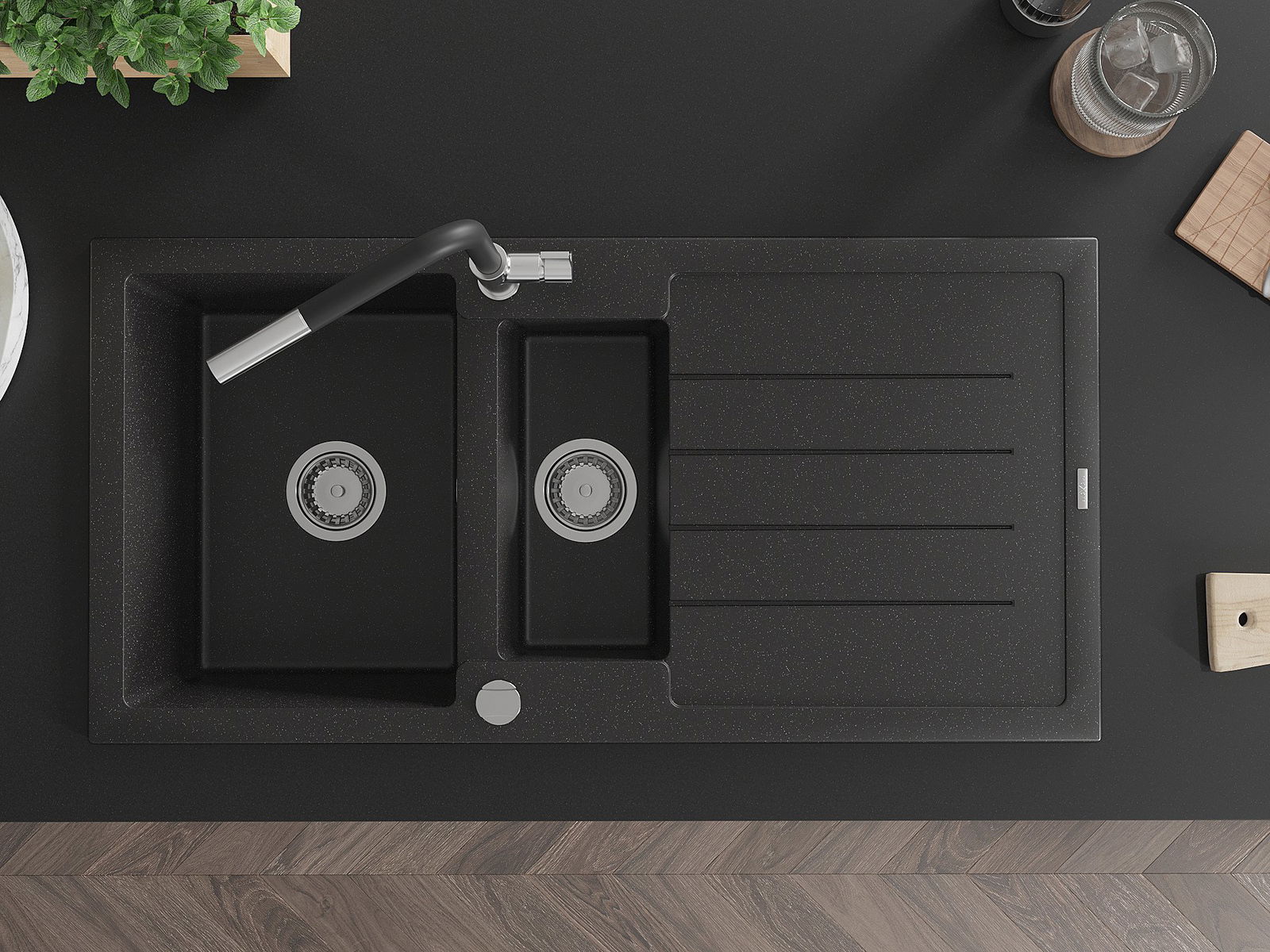 Mexen Andres zlewozmywak granitowy 1,5-komorowy z ociekaczem i baterią kuchenną Flora, czarny/srebrny - 6515-73-670401-07