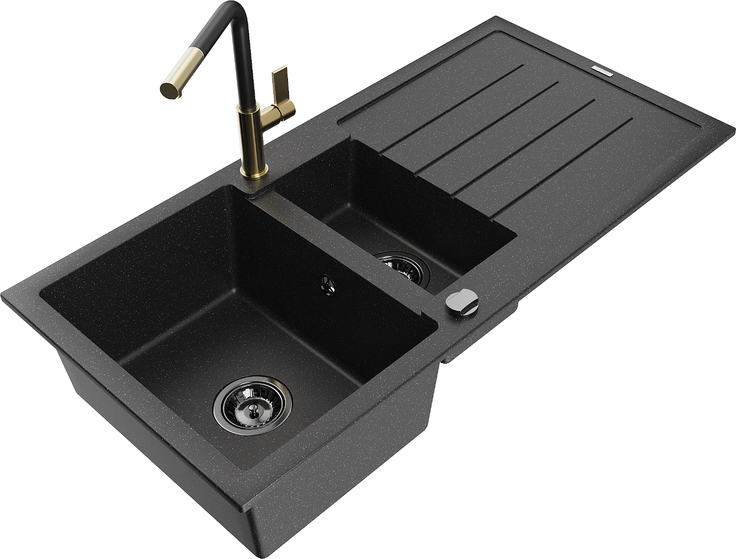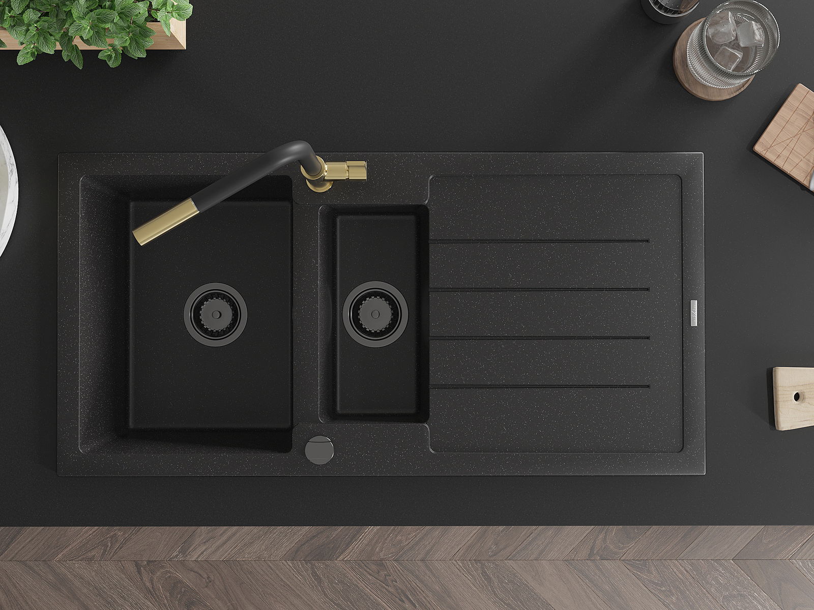 Mexen Andres zlewozmywak granitowy 1,5-komorowy z ociekaczem i baterią kuchenną Flora, czarny/srebrny - 6515-73-670401-57-B