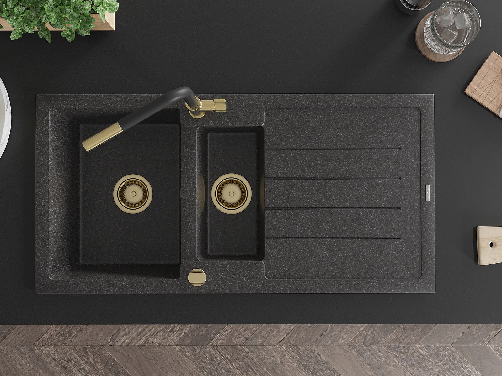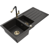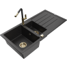 Mexen Andres zlewozmywak granitowy 1,5-komorowy z ociekaczem i baterią kuchenną Flora, czarny nakrapiany - 6515-76-670401-57-G