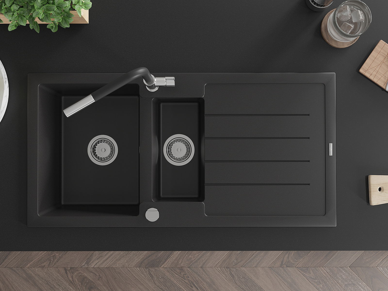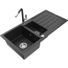 Mexen Andres zlewozmywak granitowy 1,5-komorowy z ociekaczem i baterią kuchenną Flora, czarny - 6515-77-670401-07