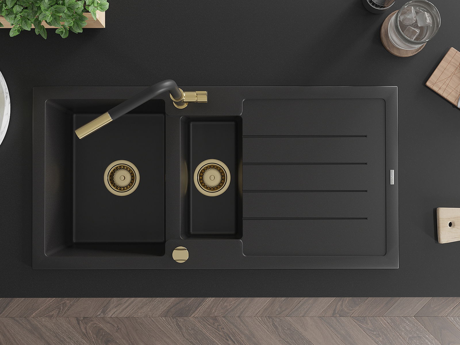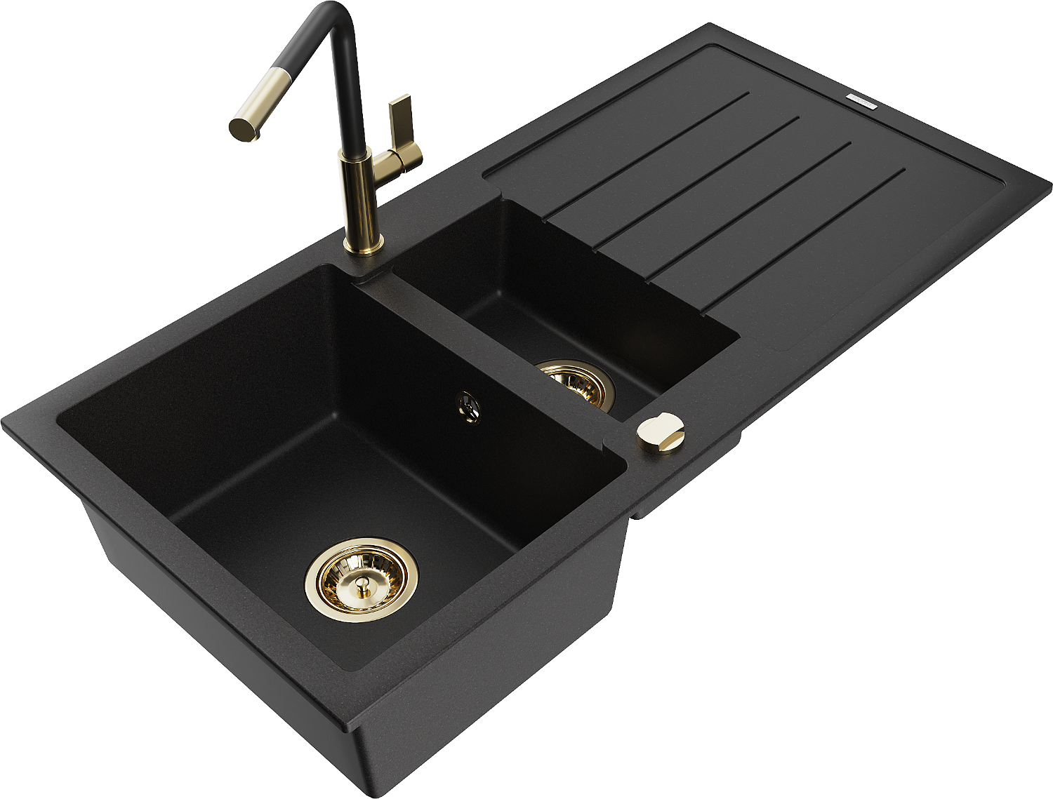 Mexen Andres zlewozmywak granitowy 1,5-komorowy z ociekaczem i baterią kuchenną Flora, czarny - 6515-77-670401-57-G