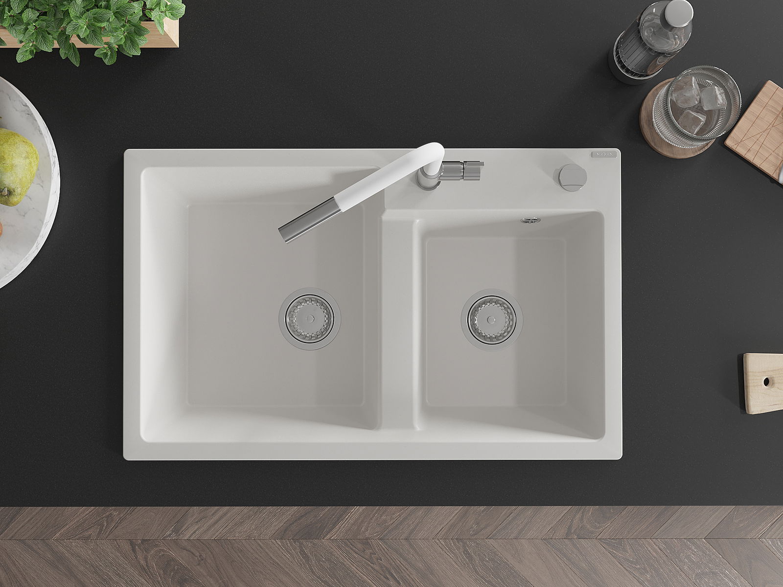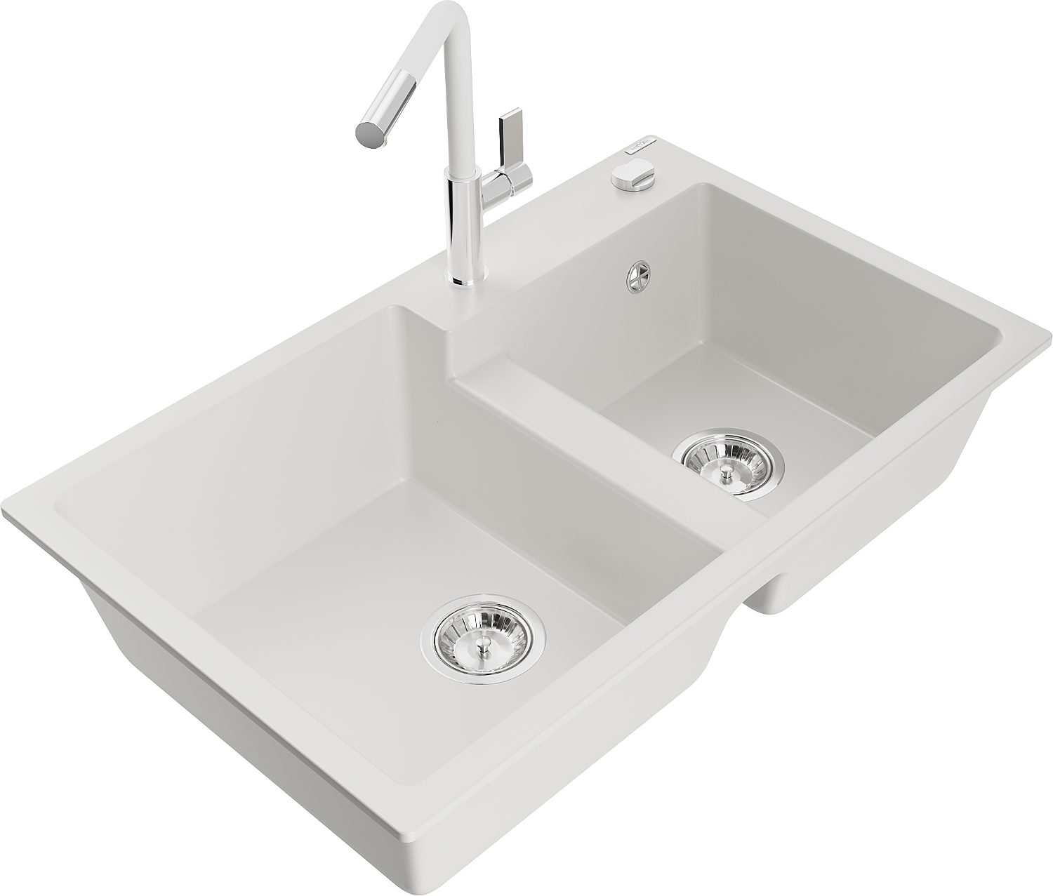 Mexen Tomas zlewozmywak granitowy 2-komorowy z baterią kuchenną Flora, biały - 6516-20-670401-02