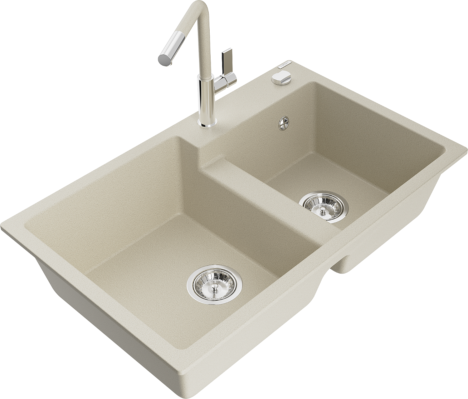 Mexen Tomas zlewozmywak granitowy 2-komorowy z baterią kuchenną Flora, beżowy - 6516-69-670401-09