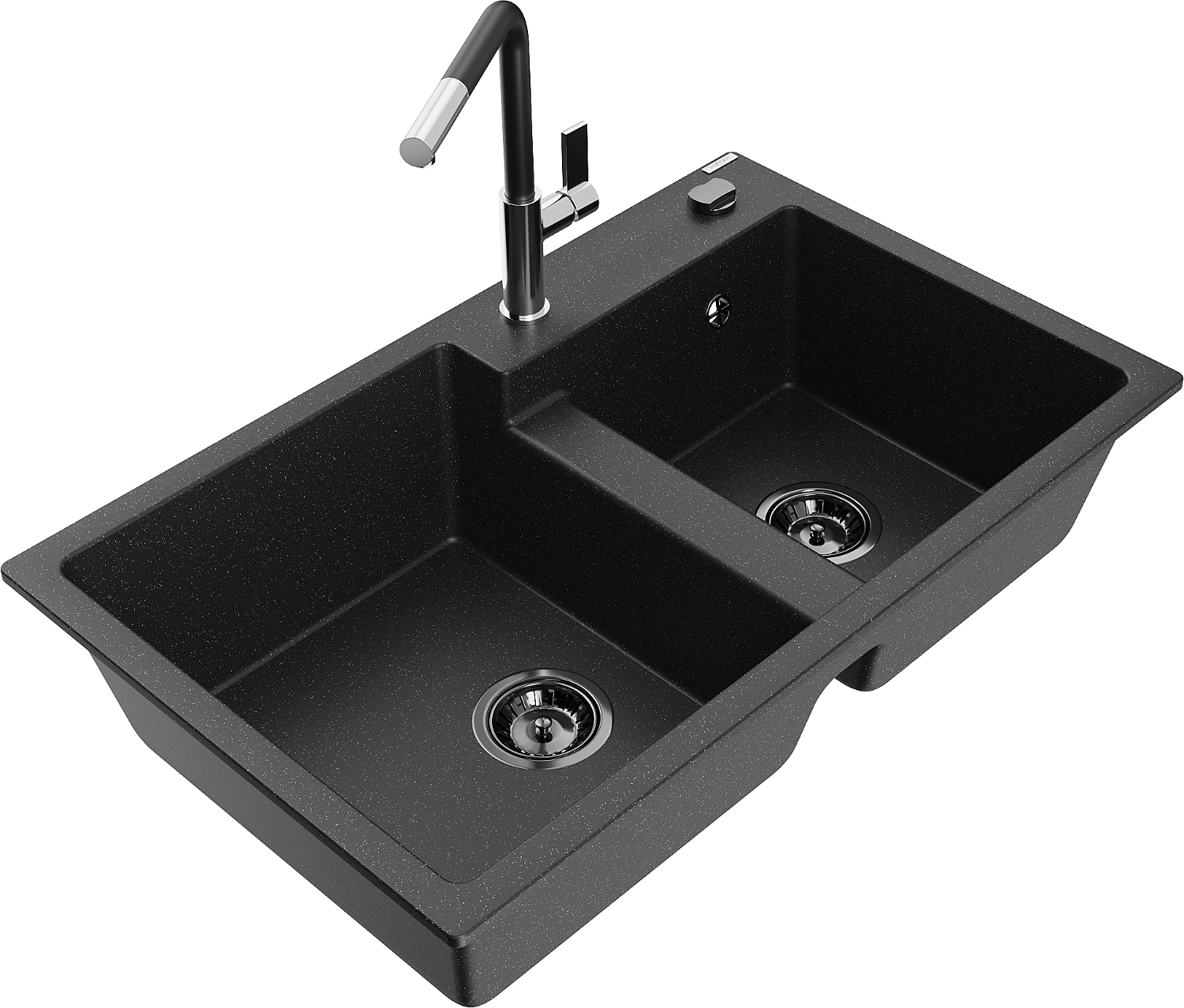 Mexen Tomas zlewozmywak granitowy 2-komorowy z baterią kuchenną Flora, czarny/srebrny metalik - 6516-73-670401-07-B