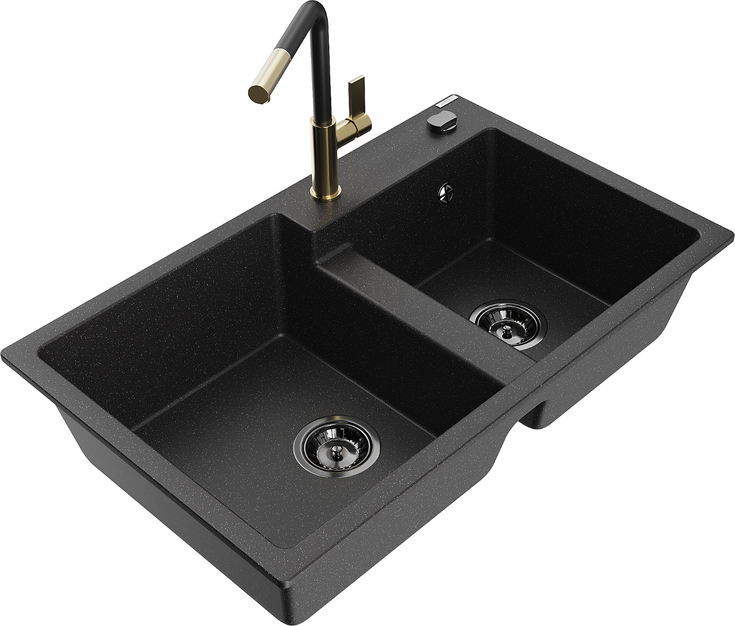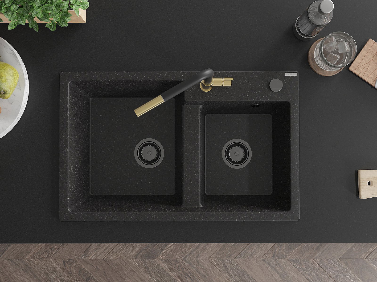 Mexen Tomas zlewozmywak granitowy 2-komorowy z baterią kuchenną Flora, czarny/srebrny metalik - 6516-73-670401-57-B