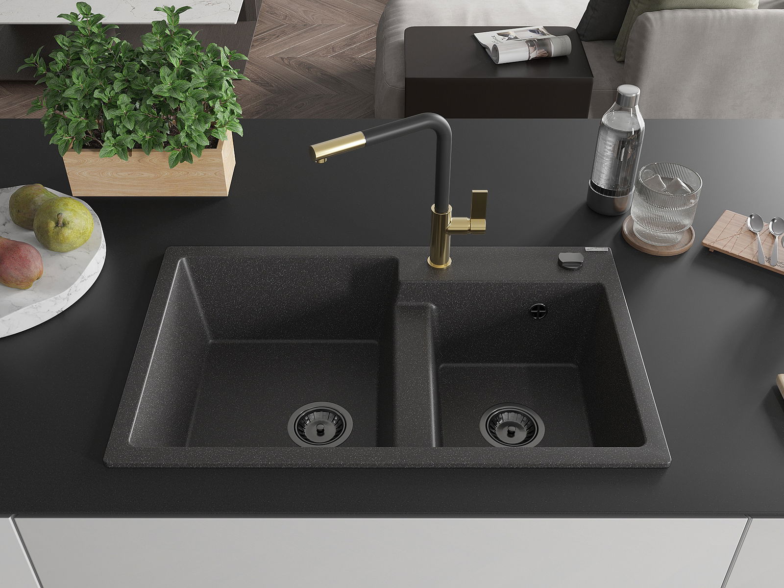 Mexen Tomas zlewozmywak granitowy 2-komorowy z baterią kuchenną Flora, czarny nakrapiany - 6516-76-670401-57-B