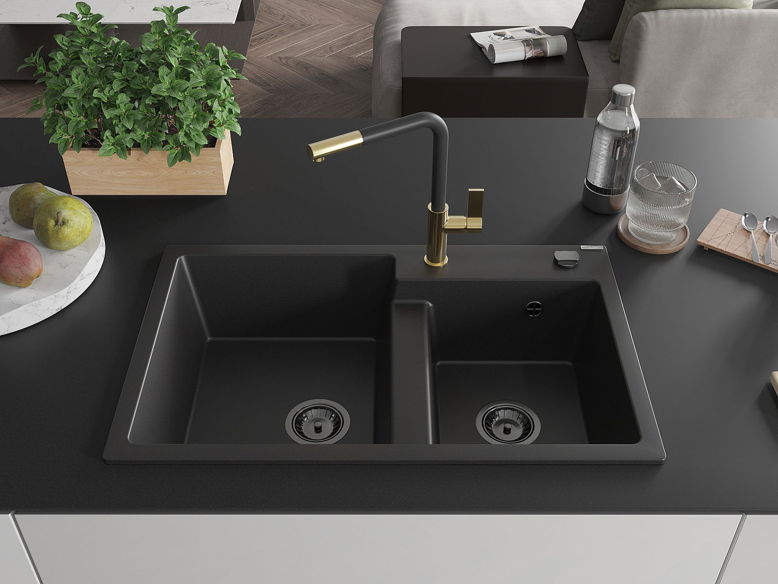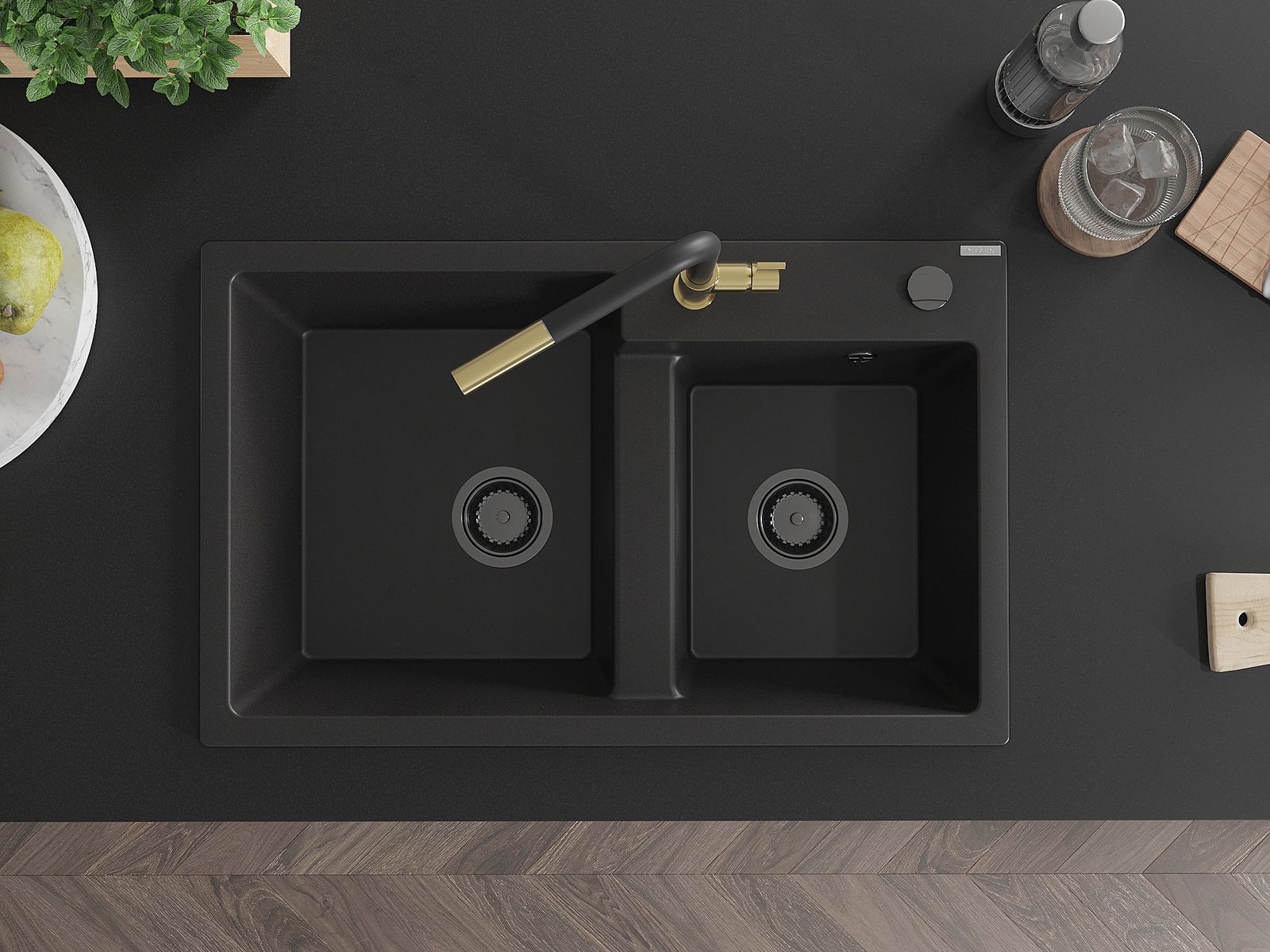 Mexen Tomas zlewozmywak granitowy 2-komorowy z baterią kuchenną Flora, czarny - 6516-77-670401-57-B
