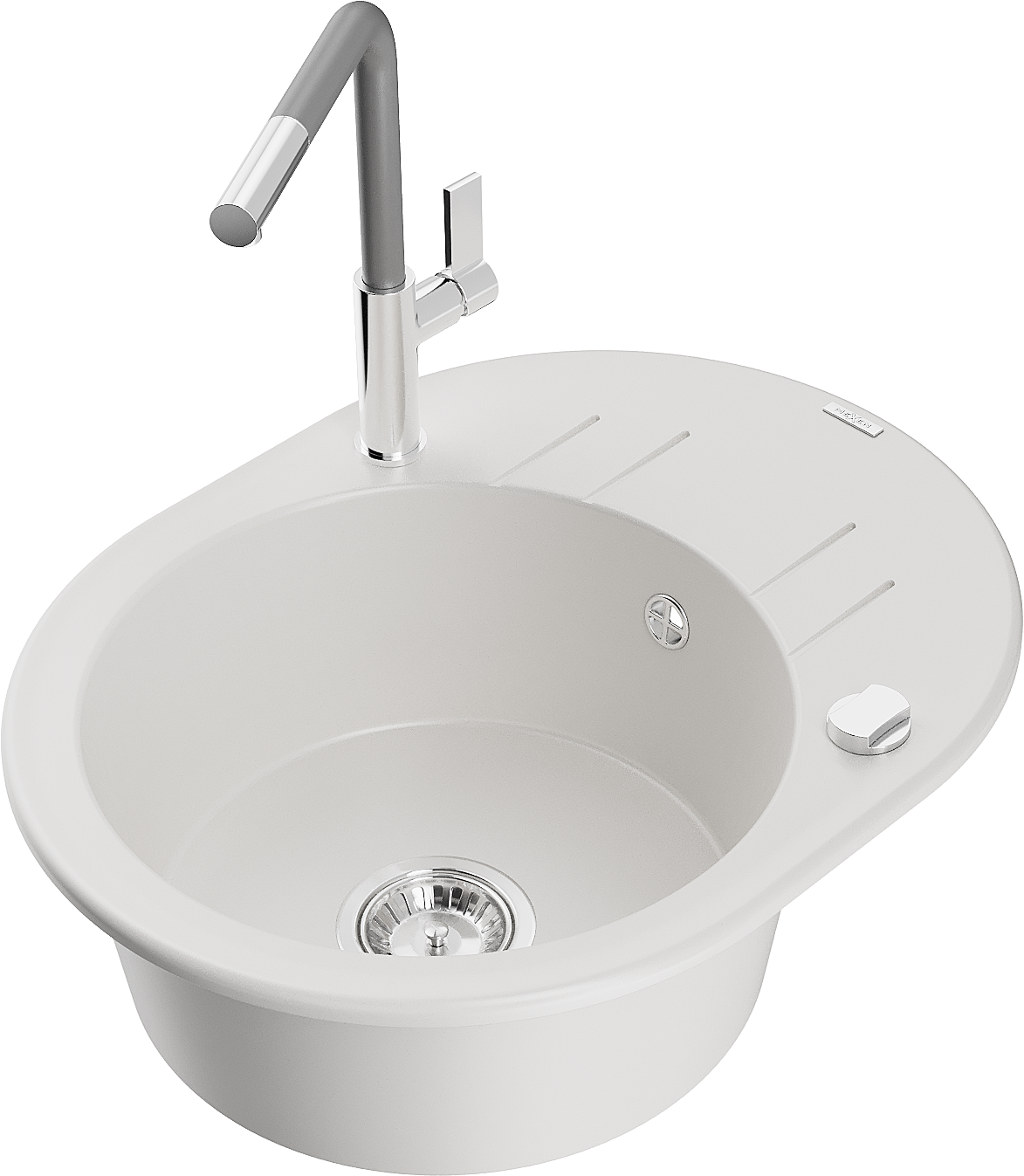 Mexen Kevin zlewozmywak granitowy 1-komorowy z ociekaczem i baterią kuchenną Flora, biały - 6517-20-670401-06