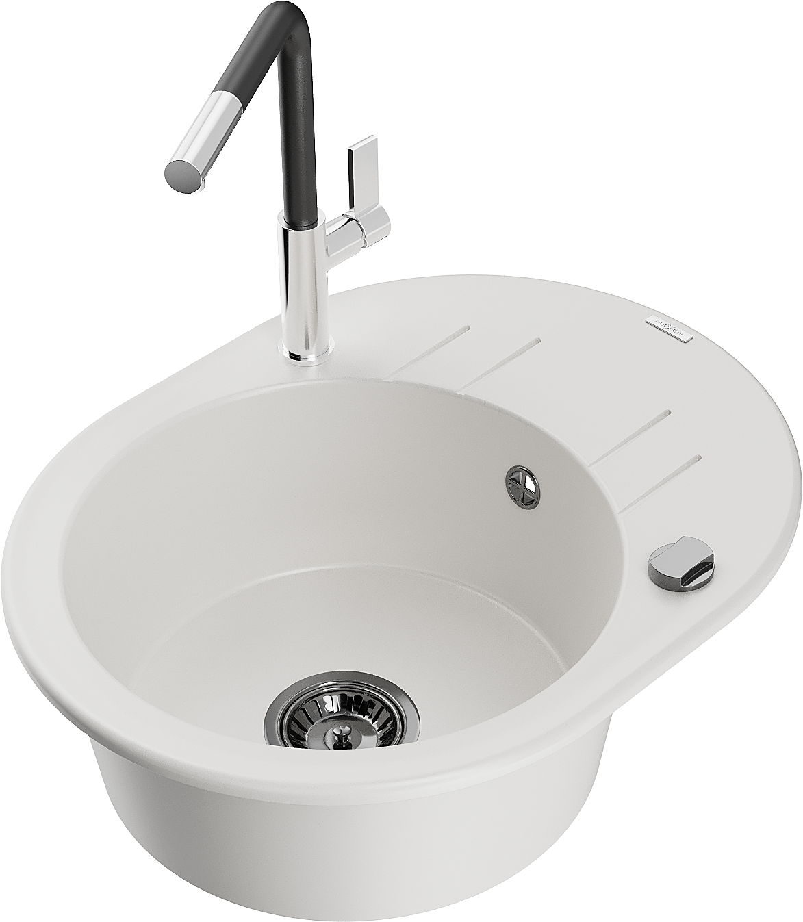 Mexen Kevin zlewozmywak granitowy 1-komorowy z ociekaczem i baterią kuchenną Flora, biały - 6517-20-670401-07-B